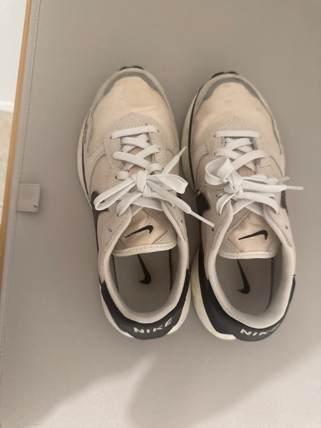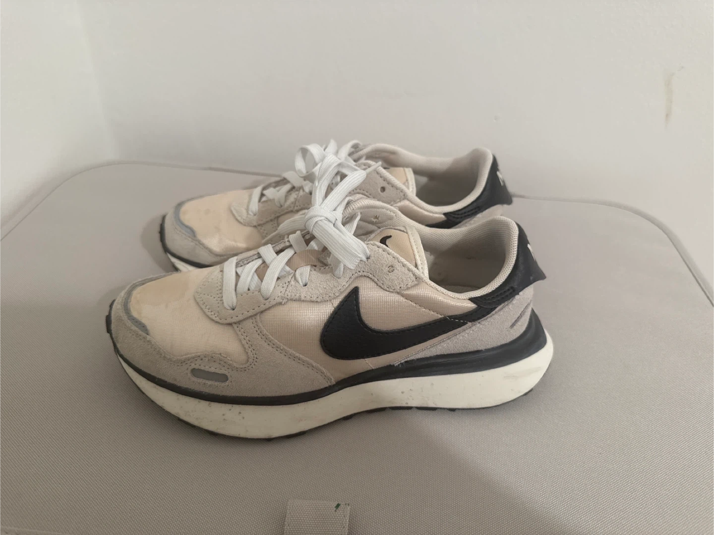Selling a pair of women's Nike Waffle Debut sneakers in cream and black. They're in great condition and ready for a new owner! Size 6 US