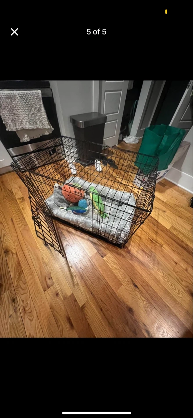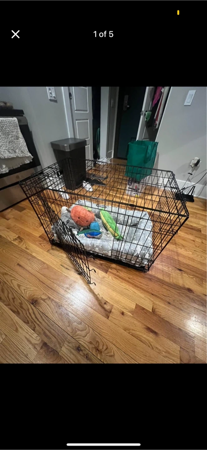 Selling a used dog crate, perfect for your furry friend. It comes with a comfy pad and some toys to keep them entertained. It's in good condition and ready for a new home