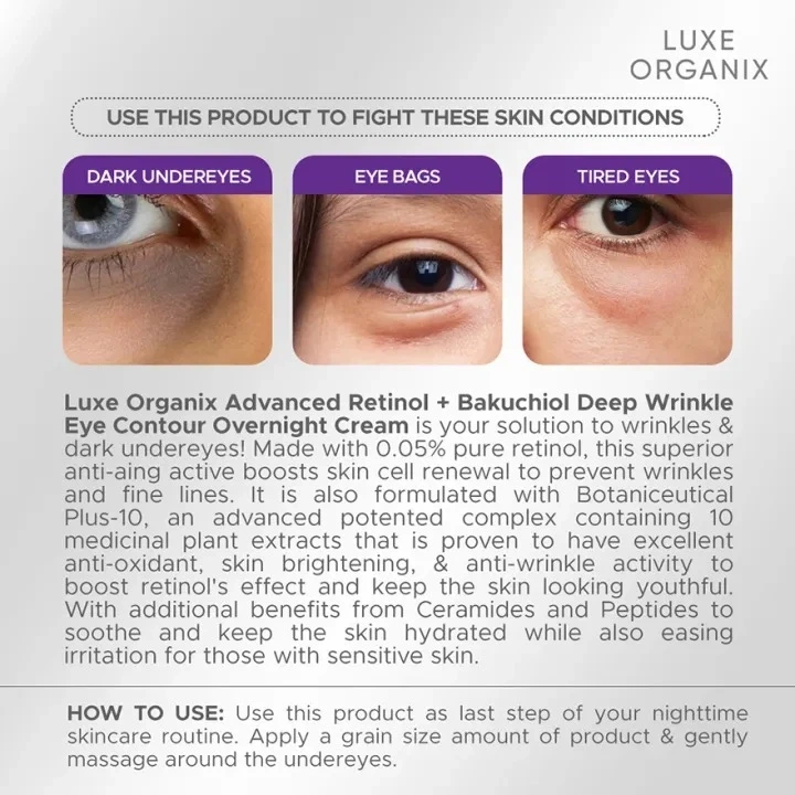 Luxe Organix Advanced Retinol + Bakuchiol Deep Wrinkle Eye Contour Overnight Cream is your solution to wrinkles & dark undereyes! Made with 0.05% pure retinol, this superior anti-aing active boosts skin cell renewal to prevent wrinkles and fine lines. It is also formulated with Botaniceutical Plus-10, an advanced potented complex containing 10 medicinal plant extracts that is proven to have excellent anti-oxidant, skin brightening, & anti-wrinkle activity to boost retinol's effect and keep the skin looking youthful. With additional benefits from Ceramides and Peptides to soothe and keep the skin hydrated while also easing irritation for those with sensitive skin.