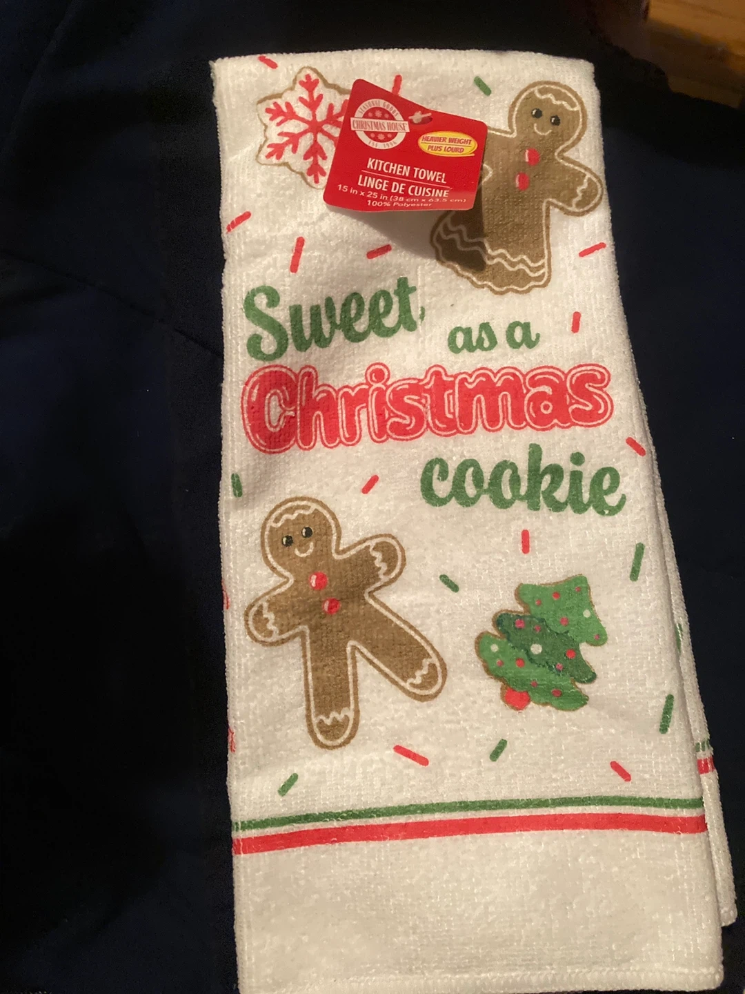 It's white with a cute "Sweet as a Christmas cookie" design, featuring gingerbread men, a Christmas tree, and snowflakes.