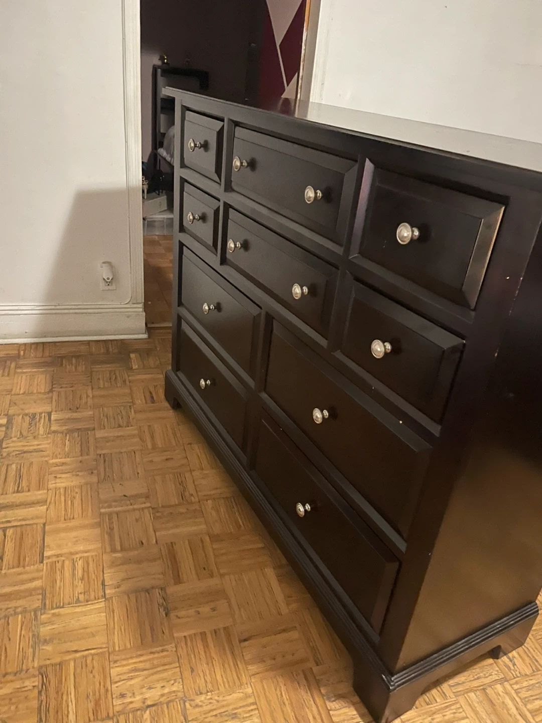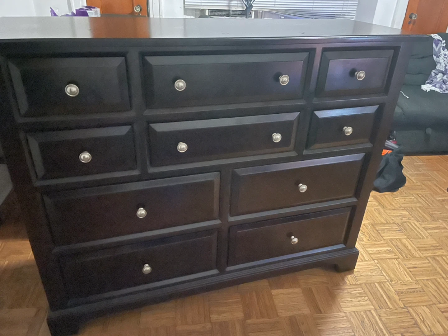 I'm selling a dark brown wood dresser with nine drawers. It's a great piece for adding storage to any room. The dresser is in good condition and ready for a new home