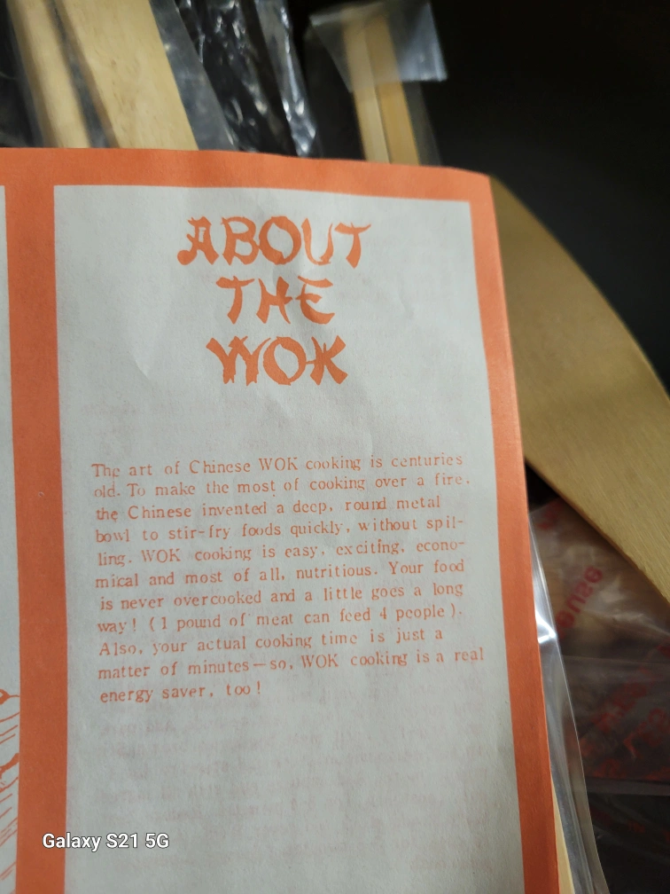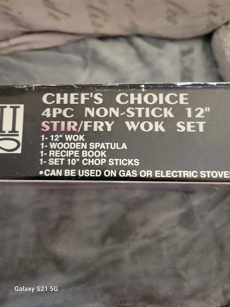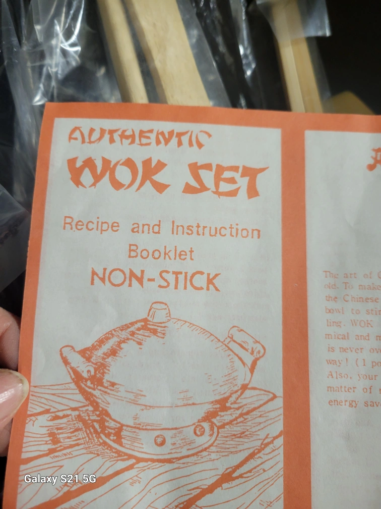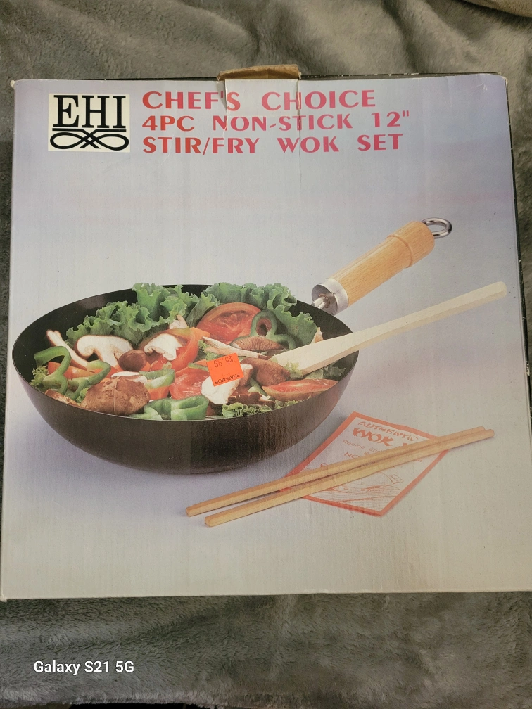 Vintage 4pc non-stick 12" stir/fry wok set, includes a 12" wok, wooden spatula, recipe book, and set of 10" chop sticks. Can be used on gas or electric stove.