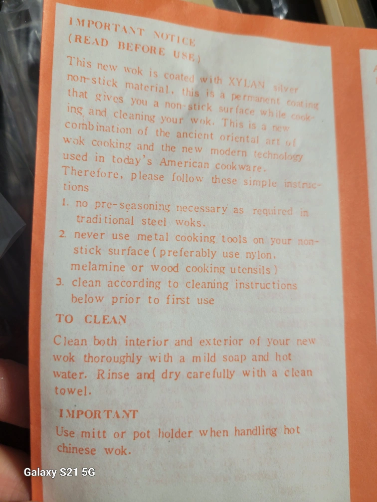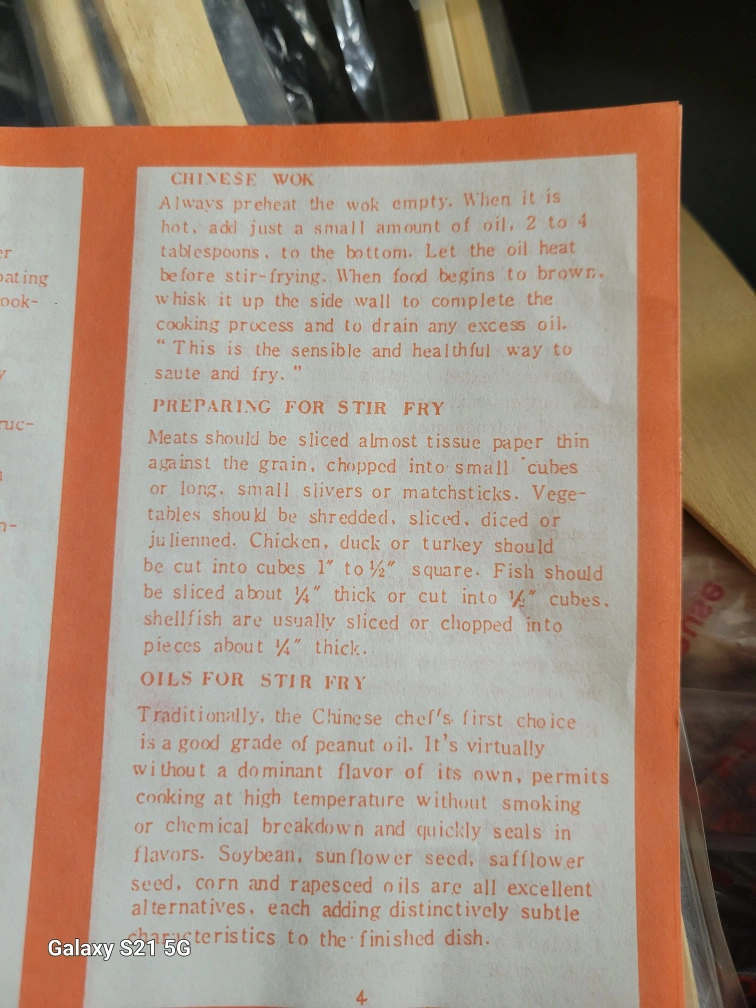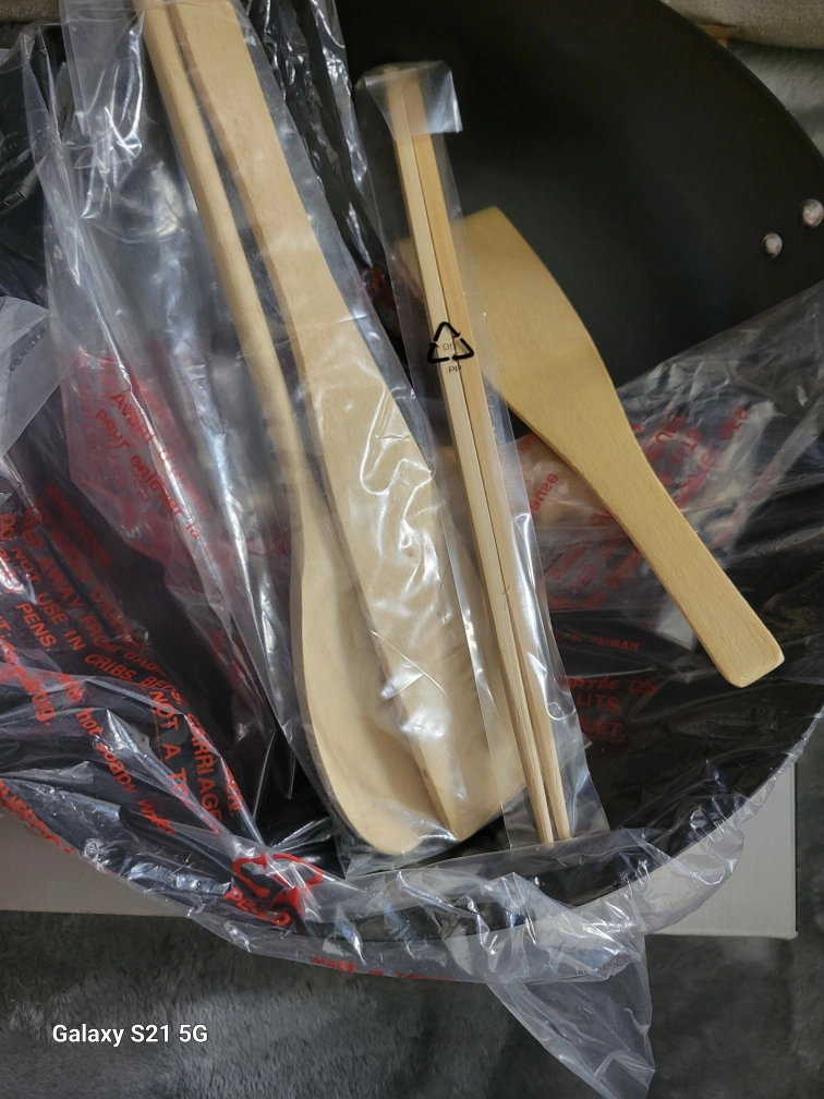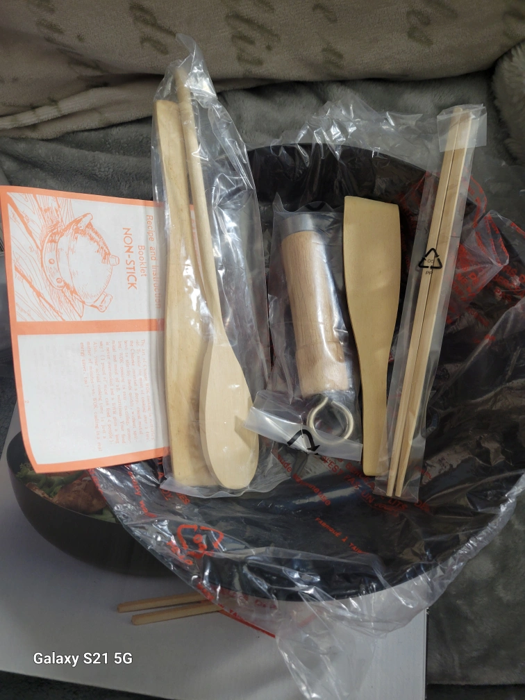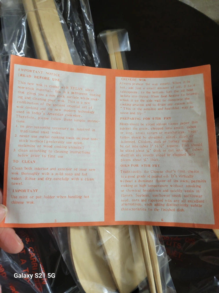 Vintage 4pc non-stick 12" stir/fry wok set, includes a 12" wok, wooden spatula, recipe book, and set of 10" chop sticks. Can be used on gas or electric stove.