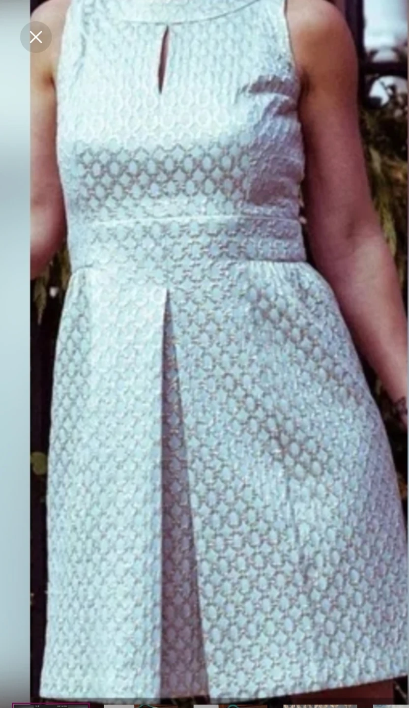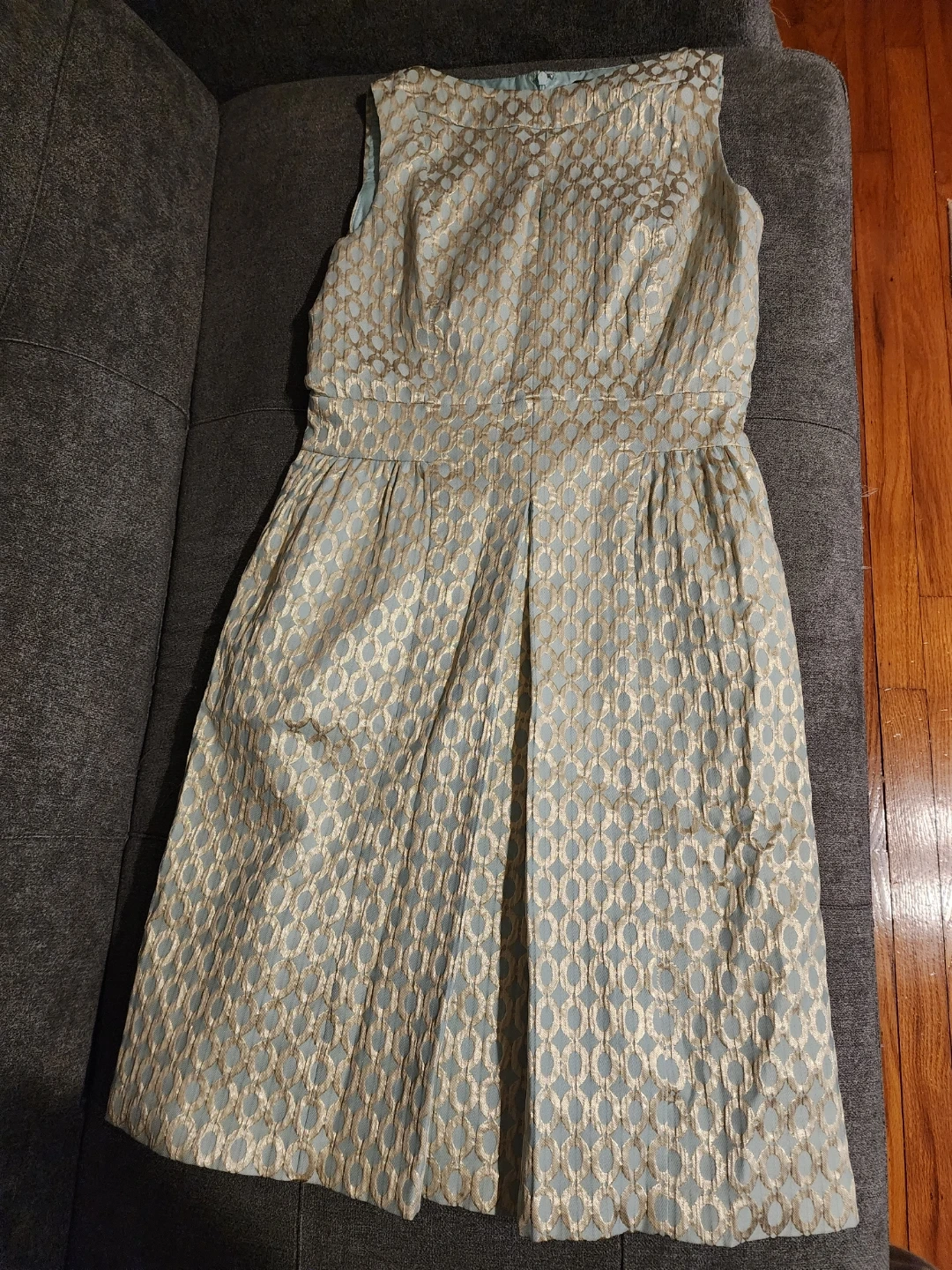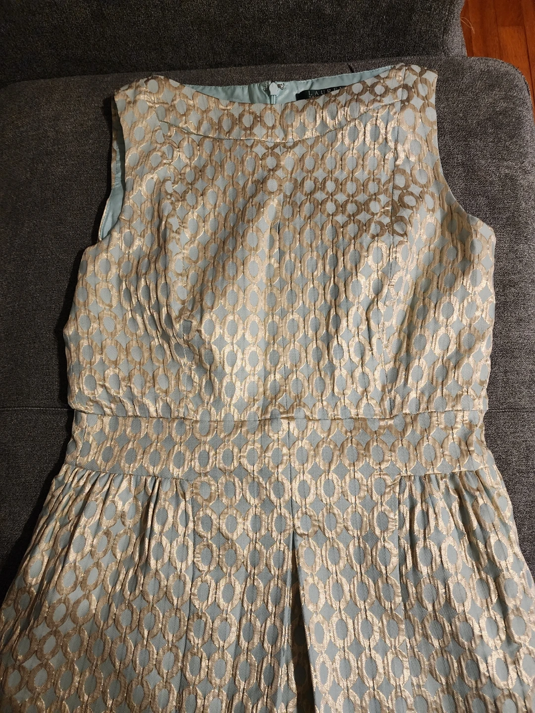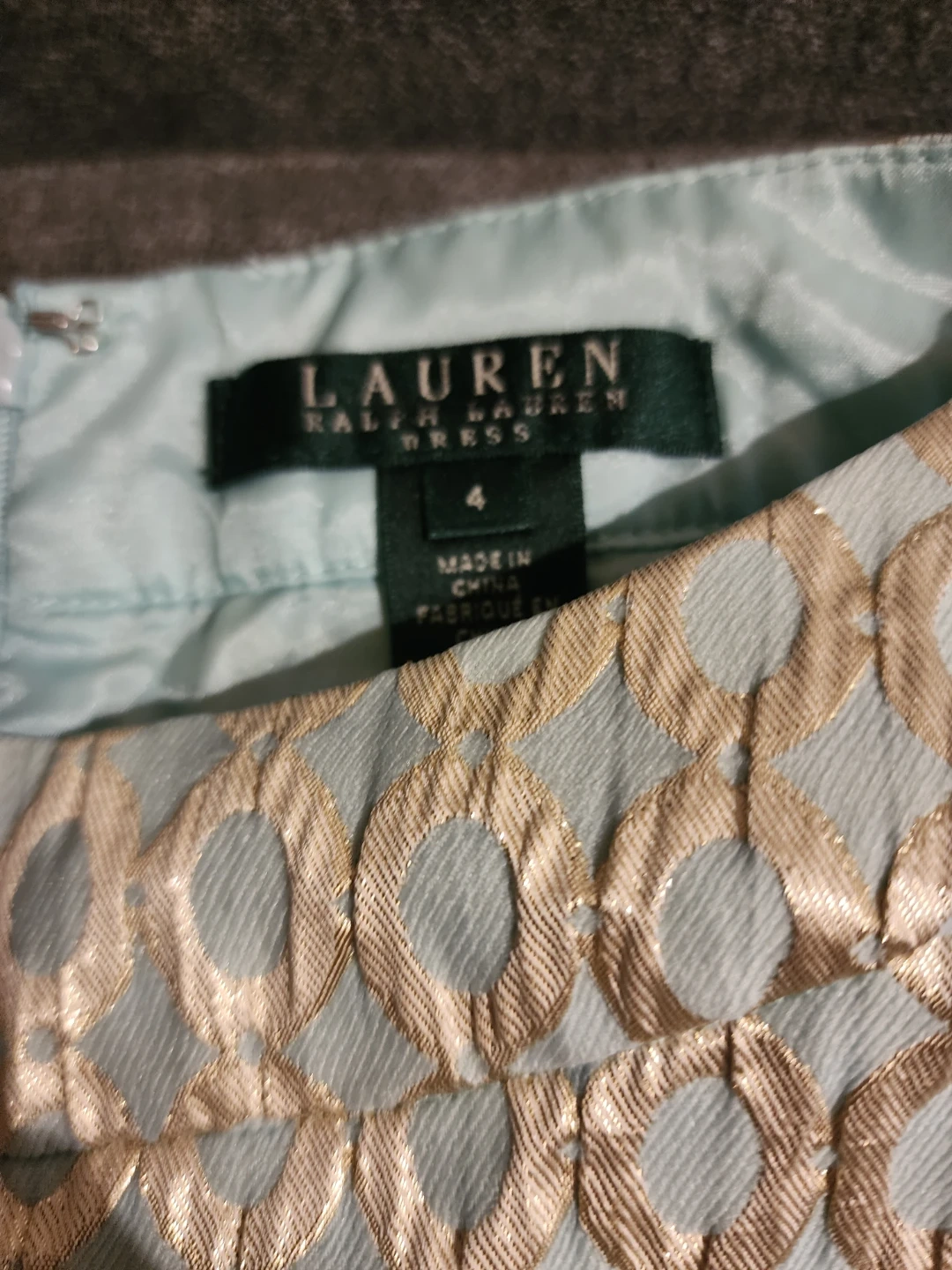 Selling a beautiful LAUREN Ralph Lauren dress in size 4. The dress features a lovely light blue and gold pattern. It's in great condition and ready for a new owner!