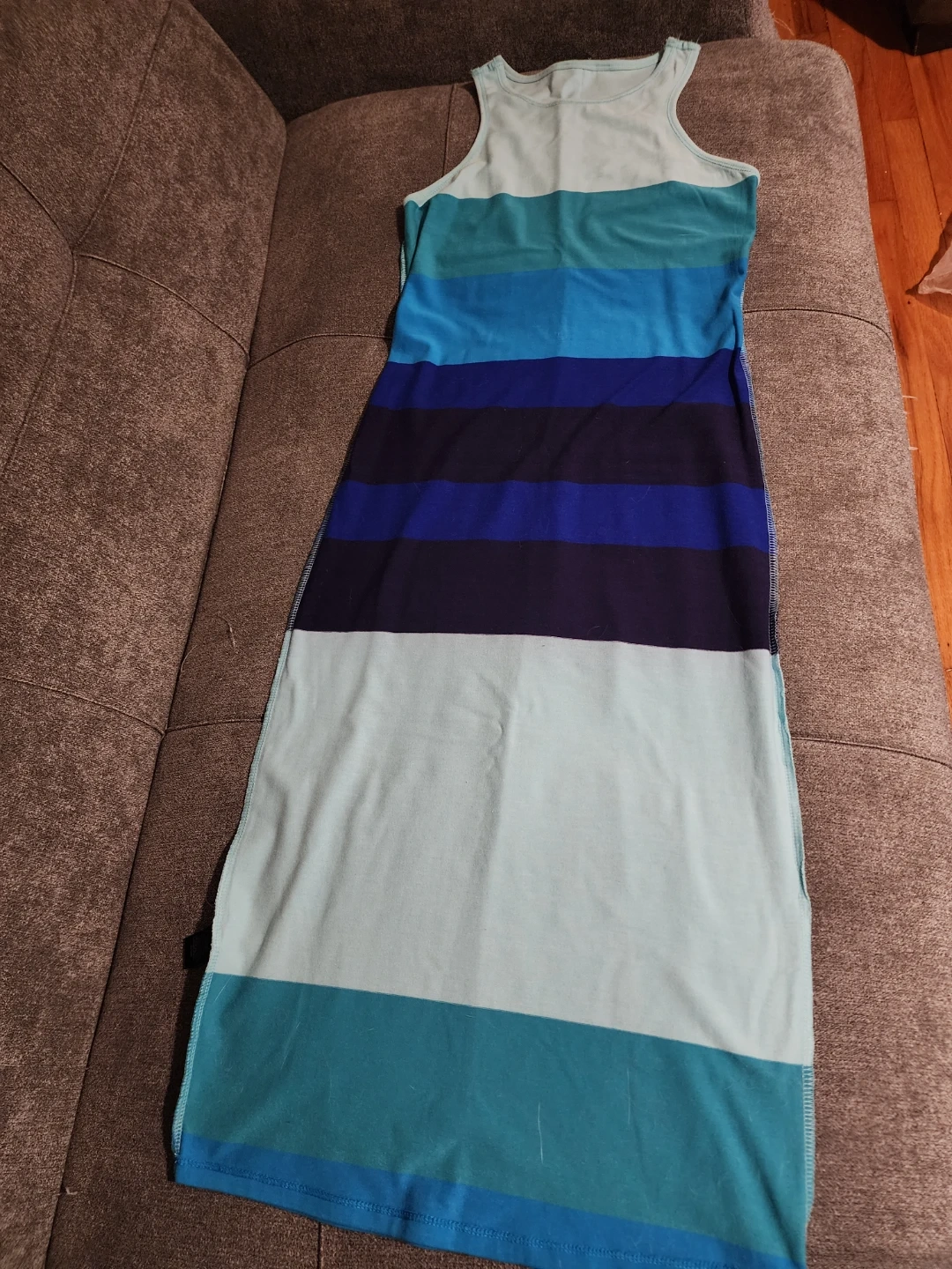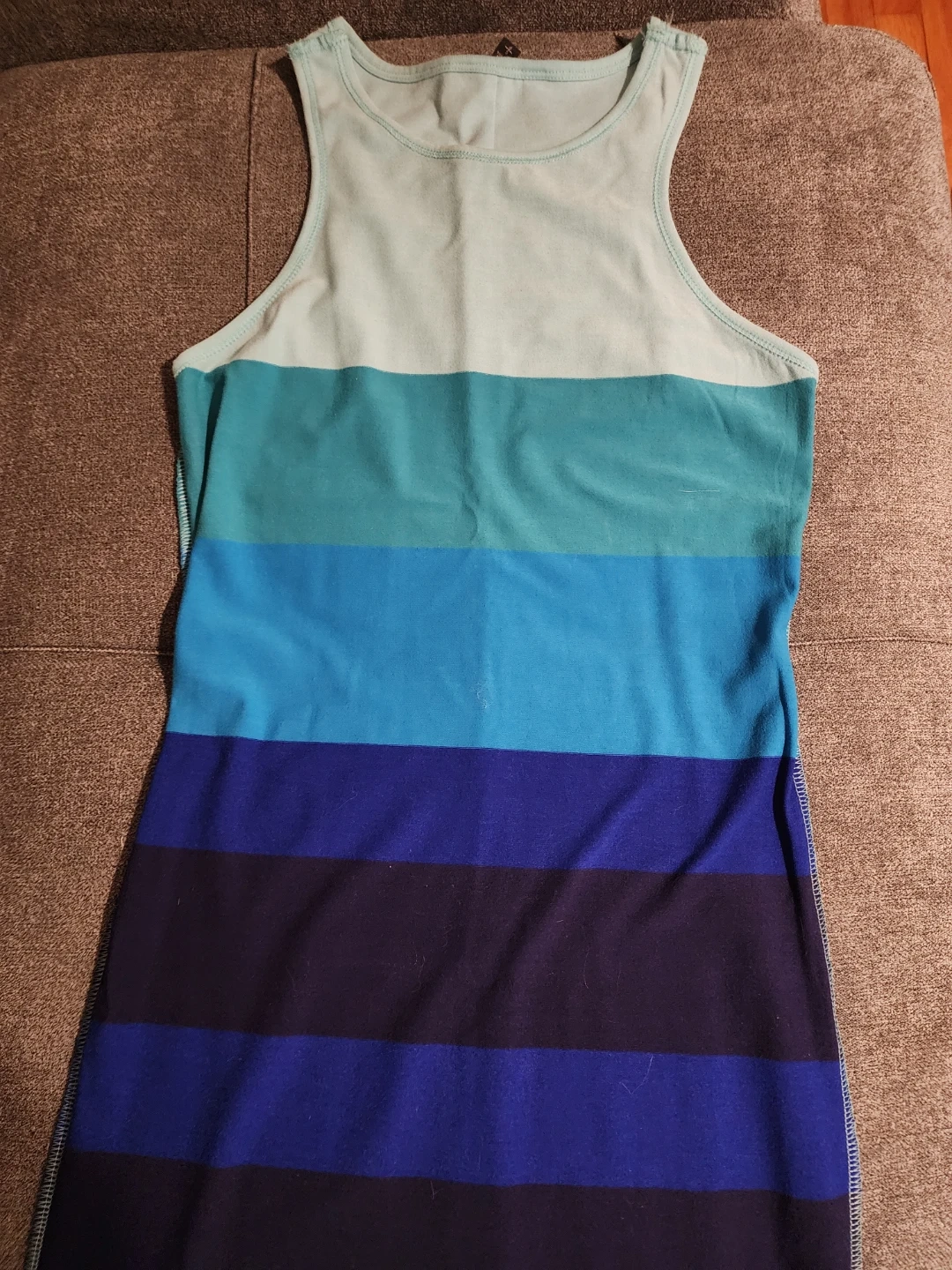 I'm selling this cute striped dress! It features various shades of blue in a horizontal striped pattern. It's perfect for a casual day out or a summer event. This dress is in great condition and ready for a new owner