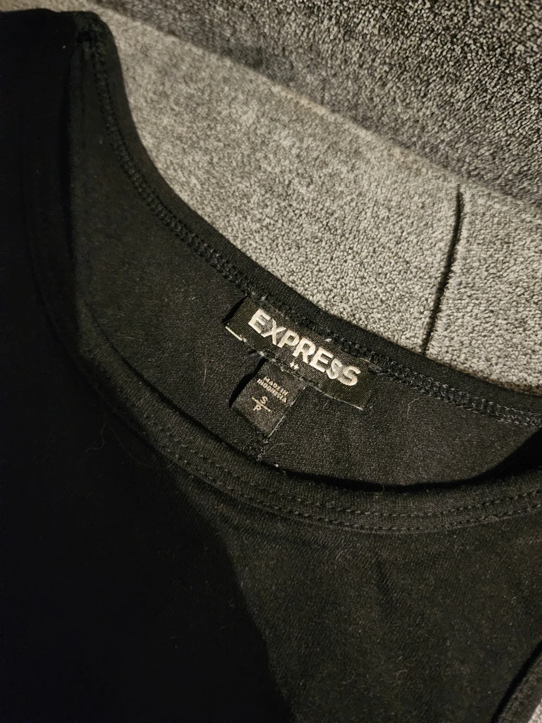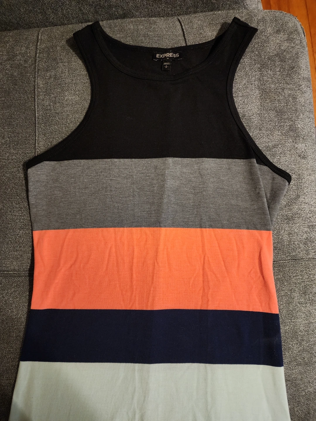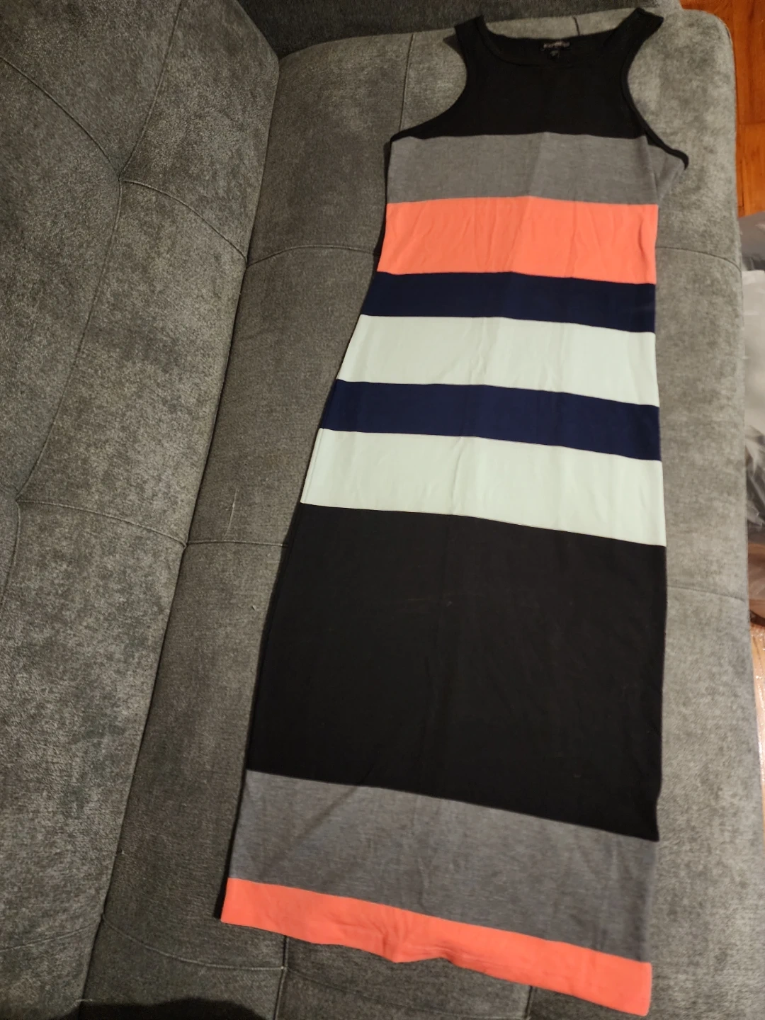 Selling an Express striped sleeveless dress in size small. The dress features a mix of colors including black, gray, coral, navy, and white. It's in great condition and ready for a new owner!