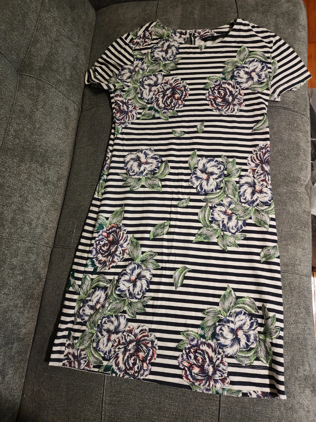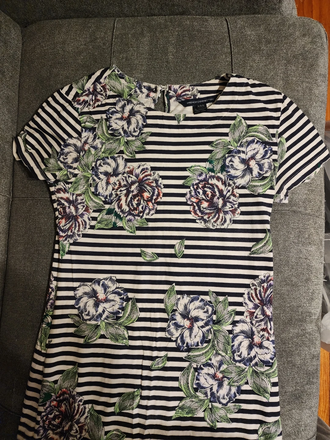 Selling a cute French Connection dress! It features a black and white striped pattern with a floral design. The size is Small/2