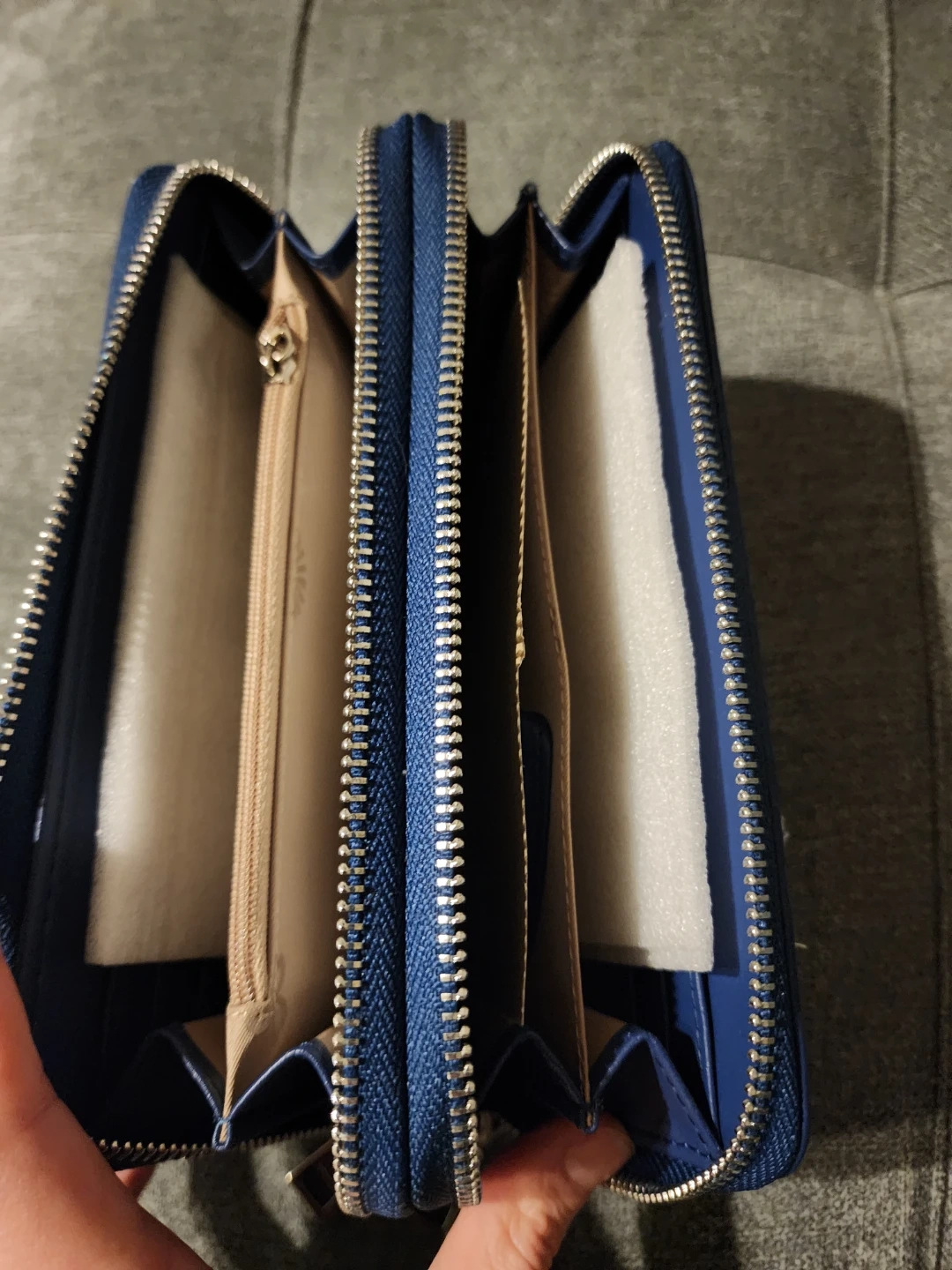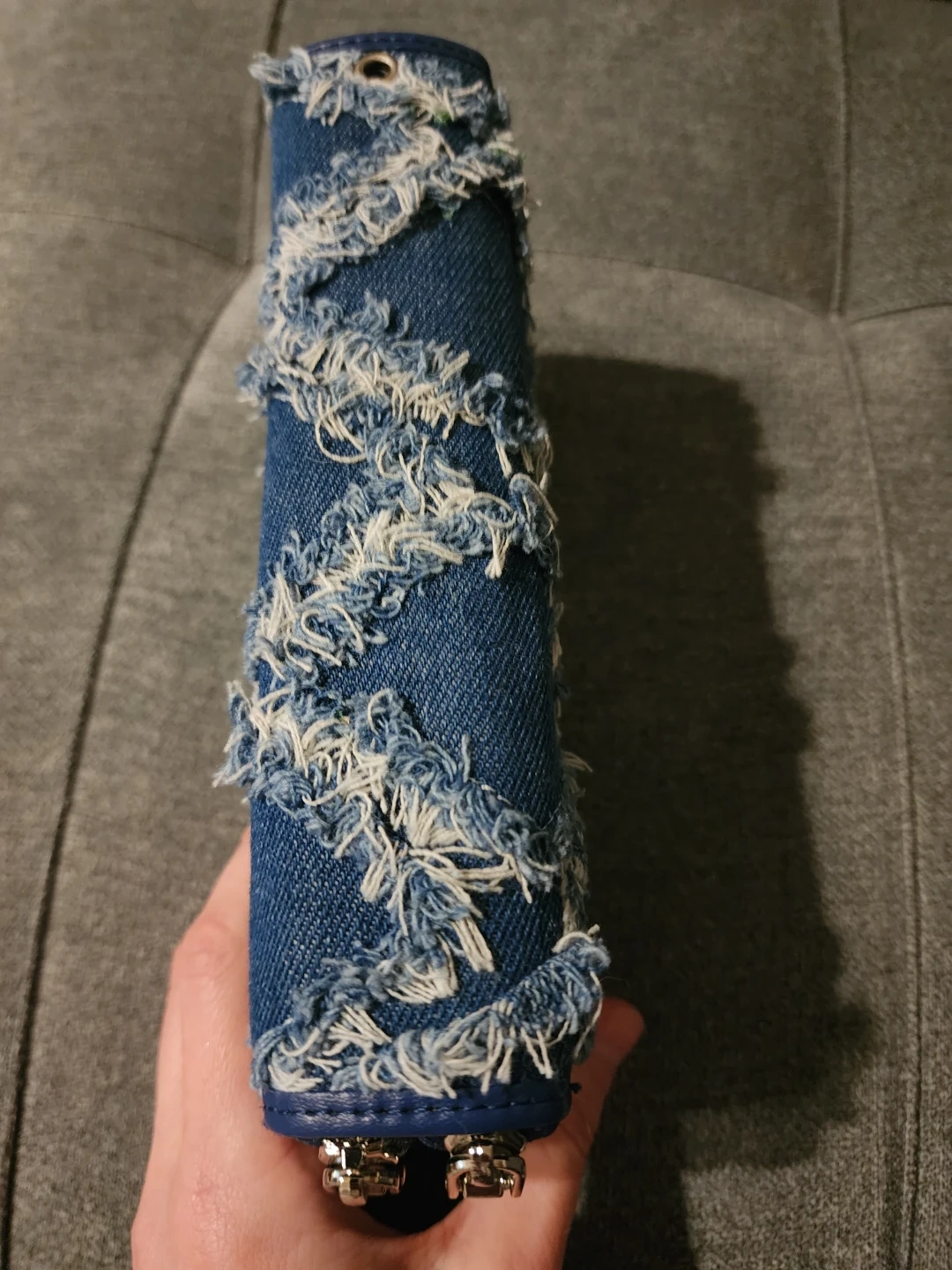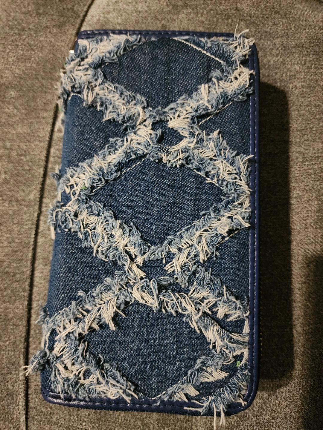 This stylish denim wallet features a unique fringe design. It has a zippered closure and plenty of compartments inside to keep your cards and cash organized. It's in great condition and ready for a new home!