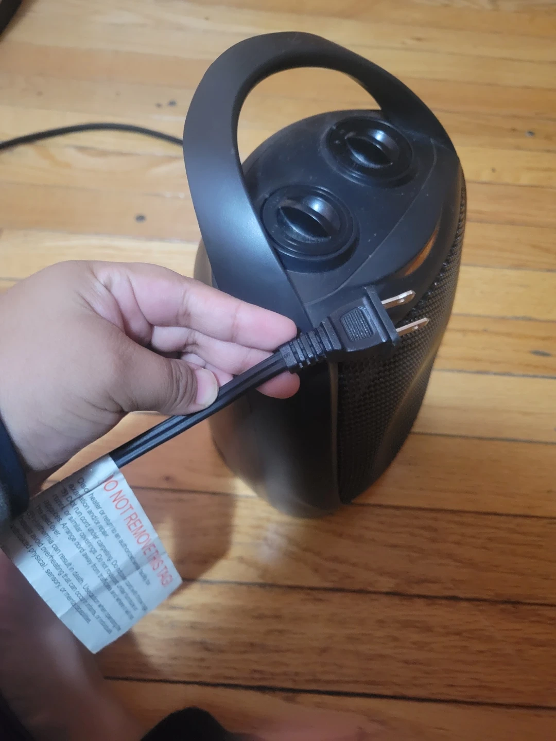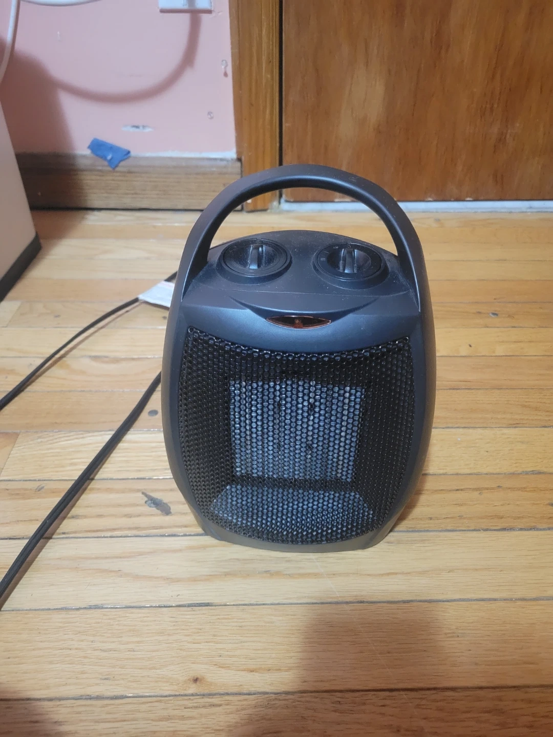 I'm selling a portable space heater in black. It features a handle for easy carrying and two dials on the top for adjusting the settings. It's perfect for keeping a small area warm and cozy! Perfect if your camping or no heater at ur apartment.