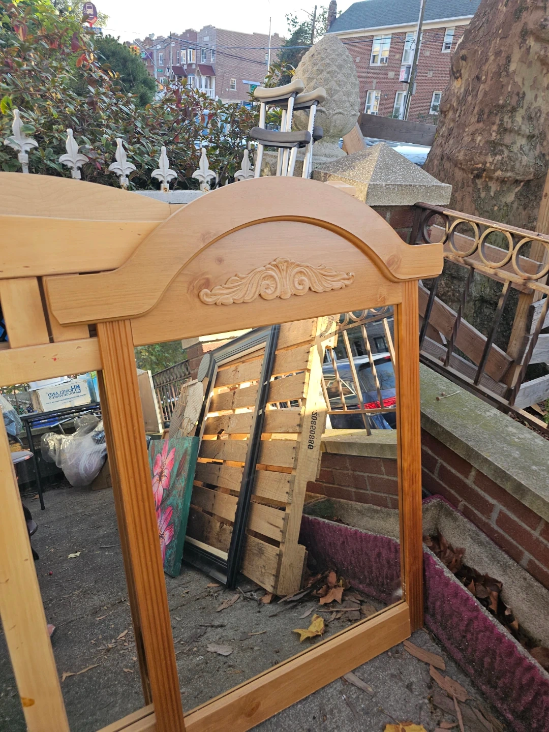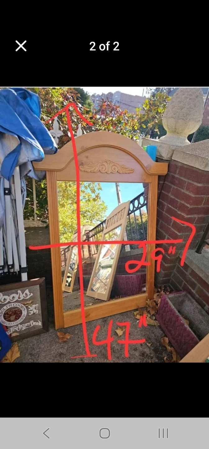 Selling a wooden framed mirror. It has a decorative design at the top. It's a nice piece!