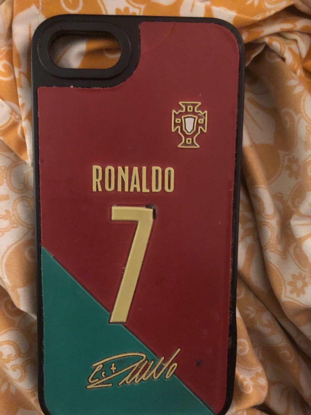 Selling a phone case with Ronaldo's name and number 7 on it. It features the Portuguese coat of arms and Ronaldo's signature. It has a red and green color scheme.