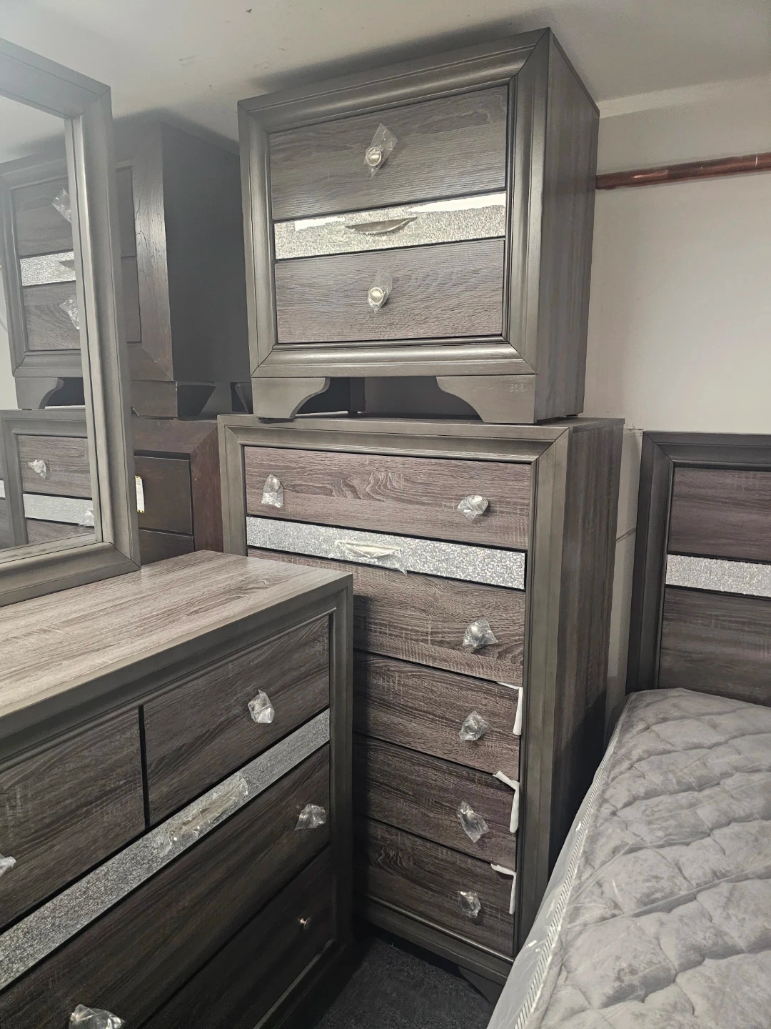 Selling a complete bedroom set. It includes a dresser with a mirror, a nightstand, and a bed frame. The set features a gray wood finish with decorative accents. Perfect for furnishing a bedroom in a coordinated style