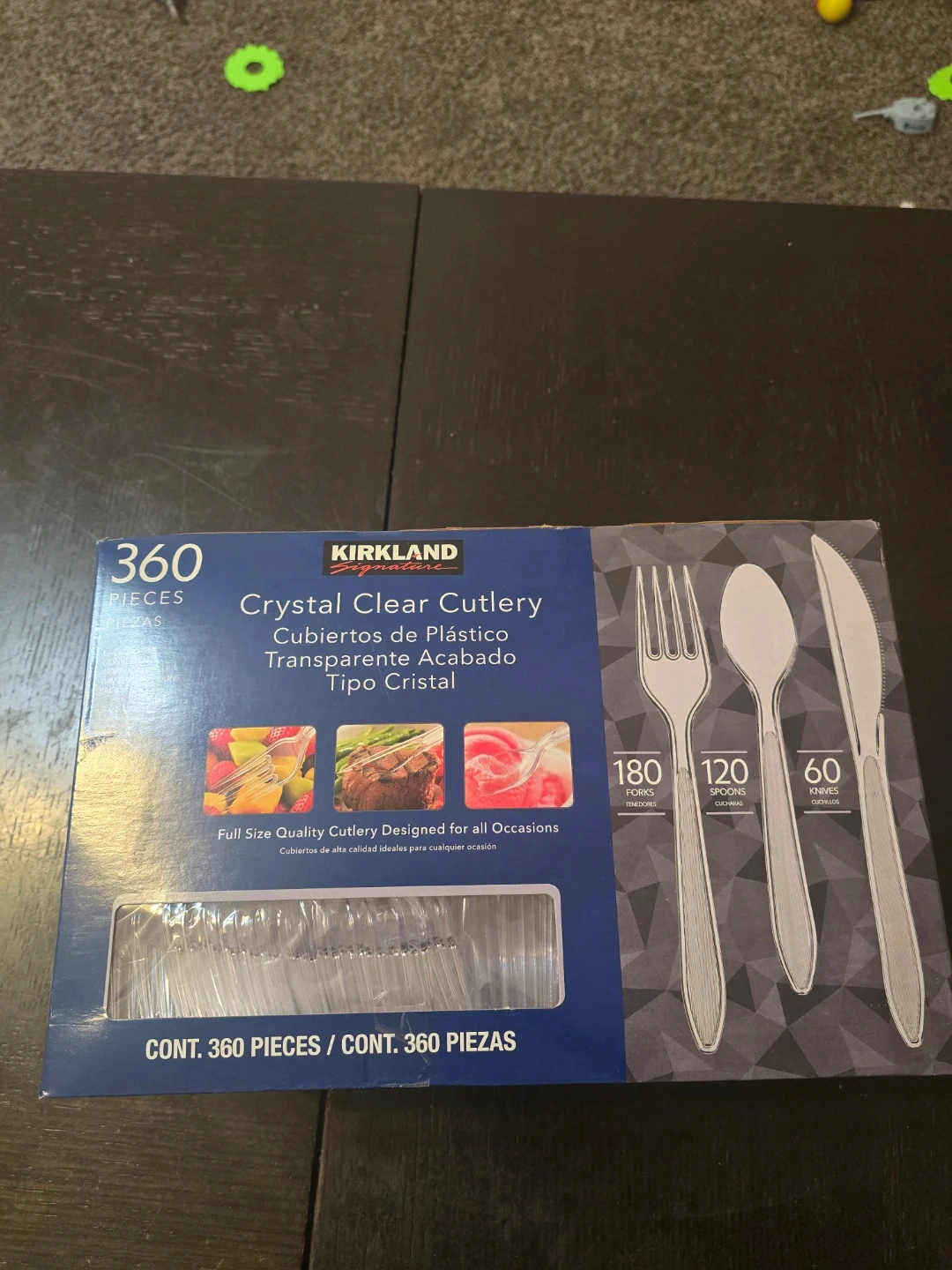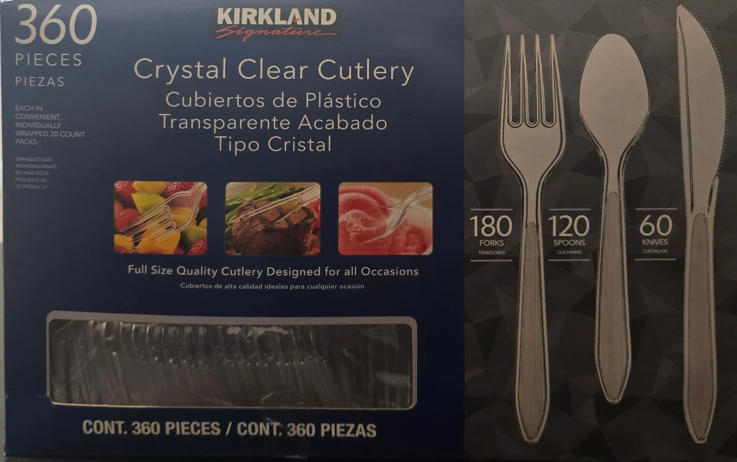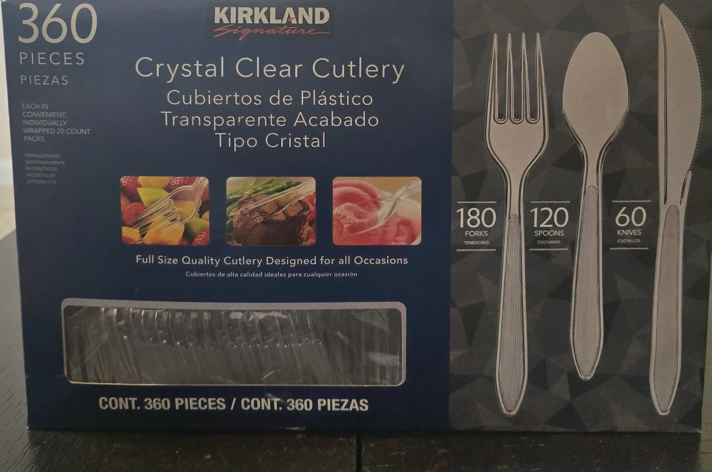 Selling a box of Kirkland Signature Crystal Clear Cutlery. The box contains 360 pieces, including 180 forks, 120 spoons, and 60 knives. It's full-size quality cutlery designed for all occasions