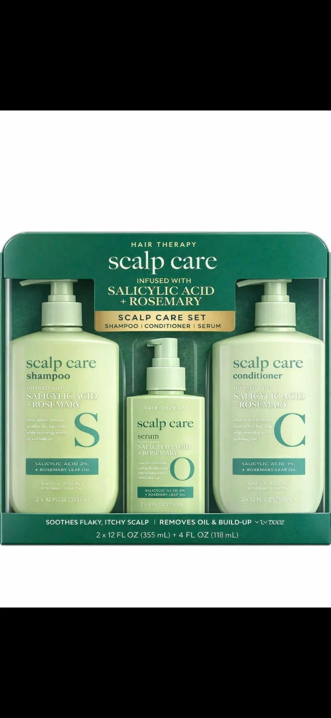 This set includes scalp care shampoo, conditioner, and serum, infused with salicylic acid and rosemary. The shampoo and conditioner each come in 12 fl oz (355 mL) bottles, and the serum is 4 fl oz (118 mL). It soothes flaky, itchy scalp and removes oil and build-up