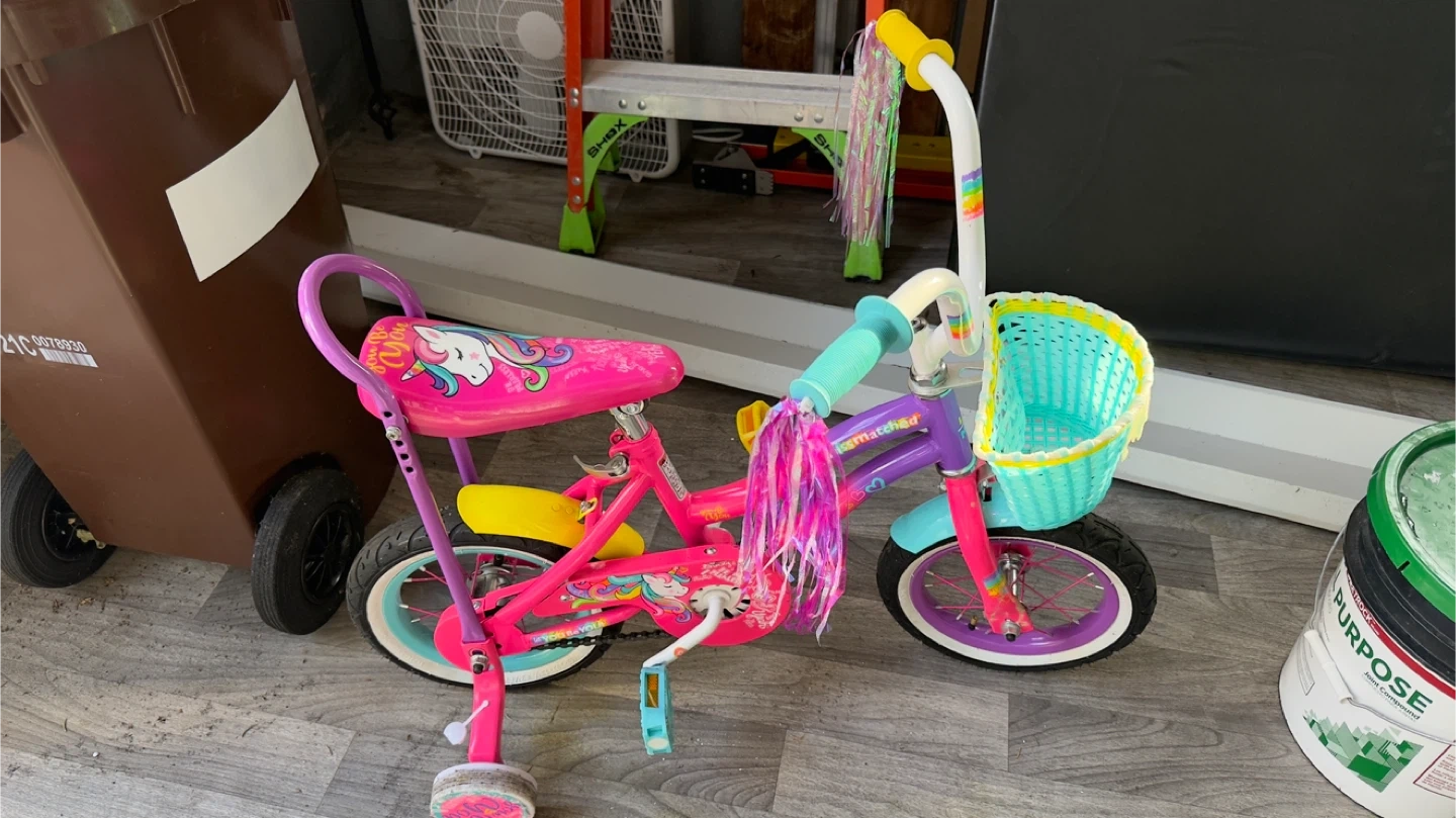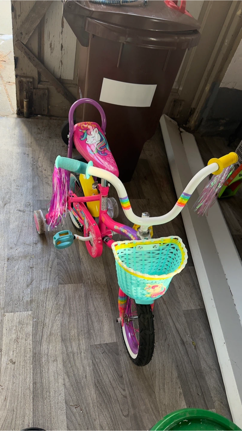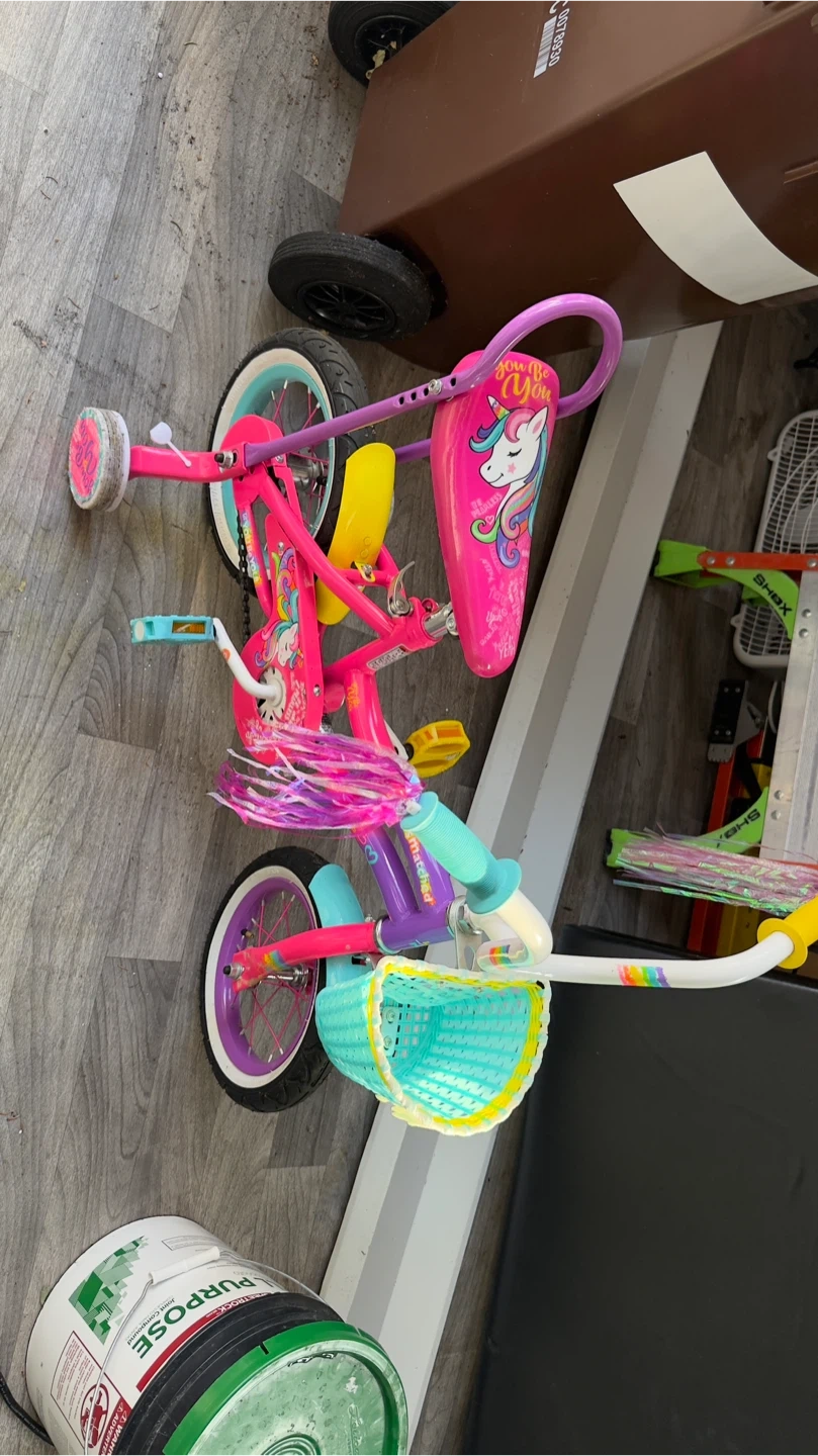 Selling a cute pink tricycle with a unicorn theme. It features a bright pink seat with unicorn graphics and colorful streamers. Comes with a light blue basket on the front for carrying treasures. Perfect for little riders!