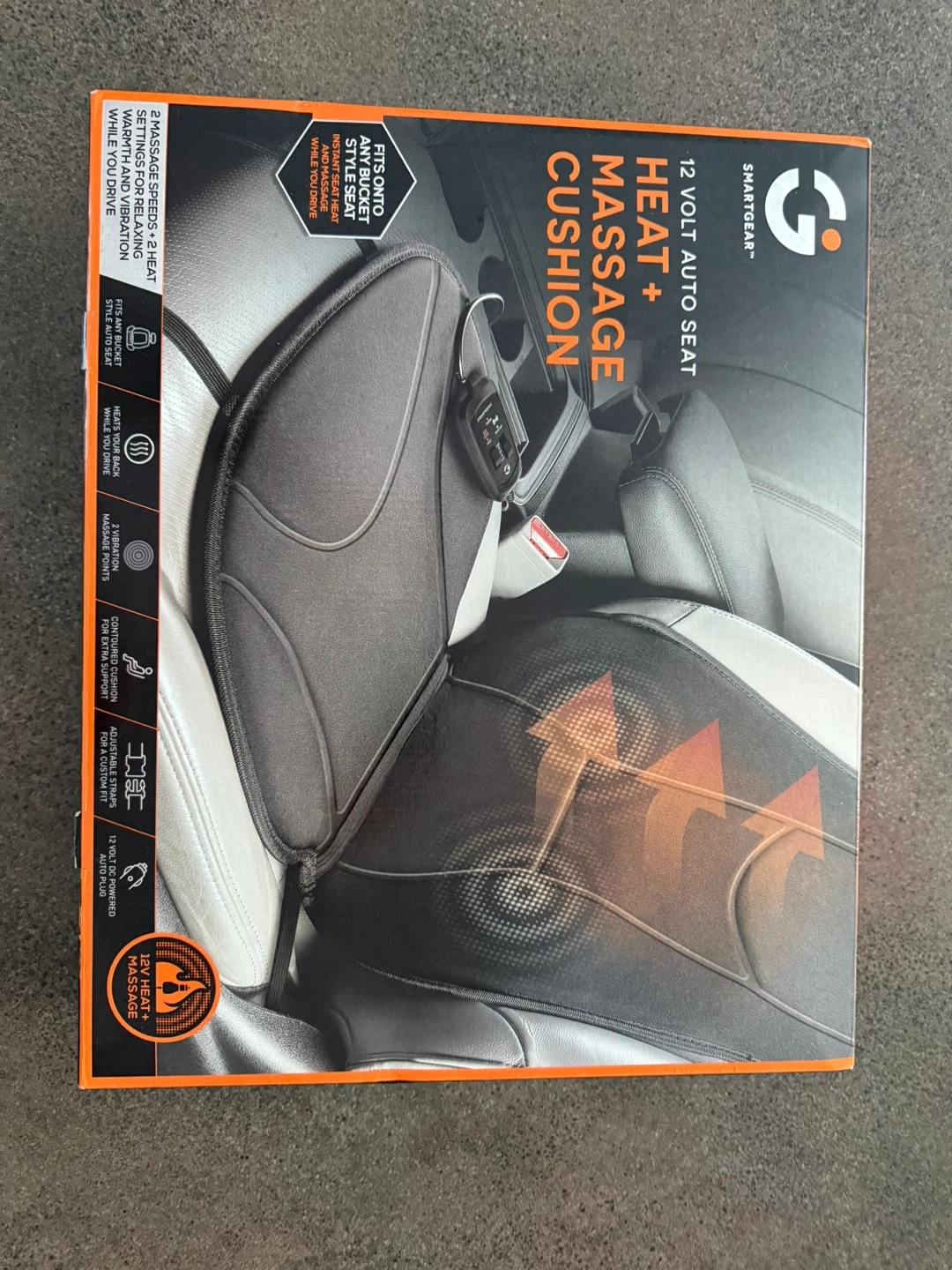 This is a 12 volt auto seat cushion that provides both heat and massage functions. It offers 2 massage speeds and 3 heat settings for relaxing comfort. Adjustable straps ensure it fits securely onto any bucket seat while you drive.
