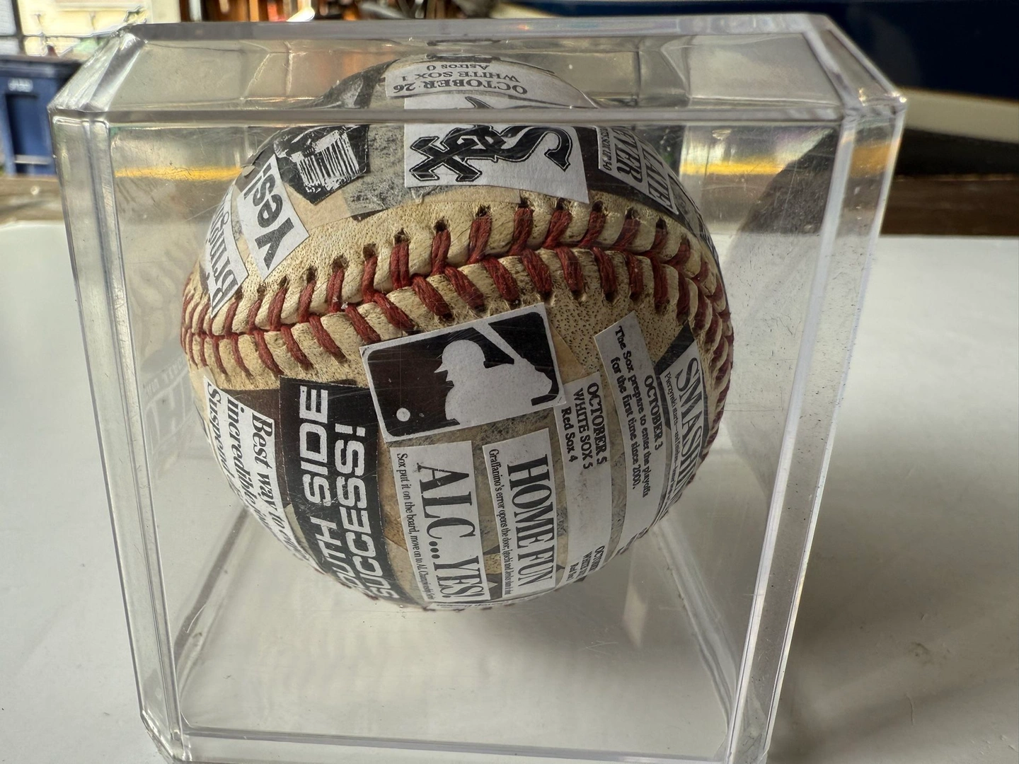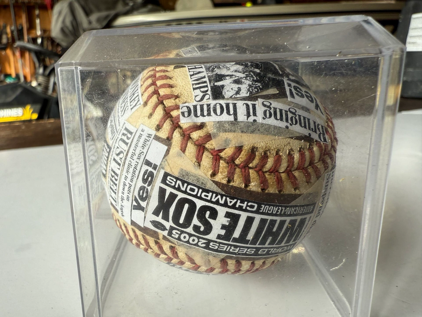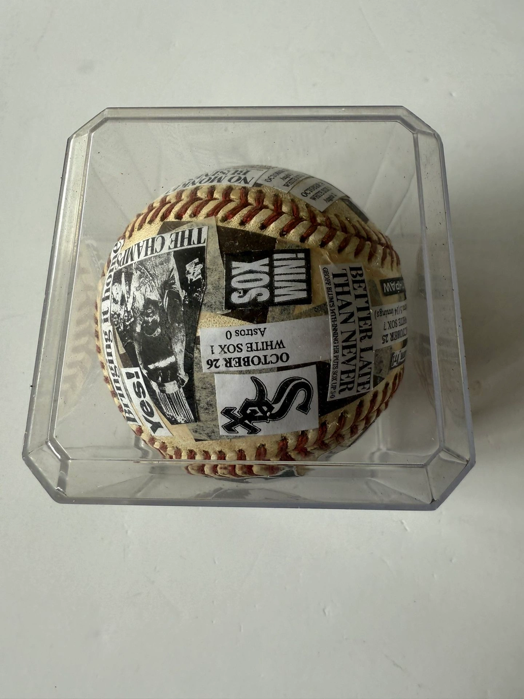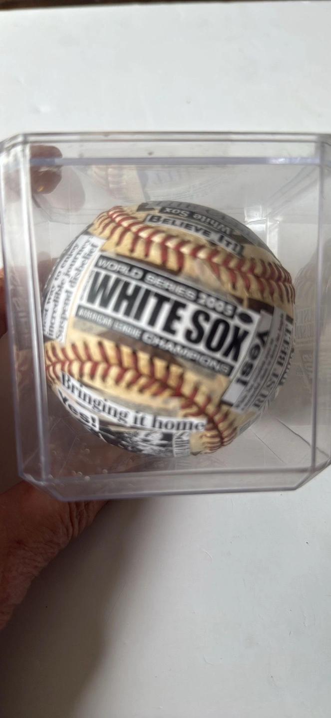 This is a commemorative baseball celebrating the Chicago White Sox winning the 2005 World Series. The ball is covered with newspaper clippings and headlines from the time of their victory. The Chicago White Sox won the World Series in 2005, defeating the Houston Astros. This was their first championship since 1917, ending an 88-year drought. The team was known for its dominant pitching rotation and won 11 of 12 playoff games. The baseball is a collectible item celebrating this historic moment for the team and its fans. Feel free to message if you have any questions!