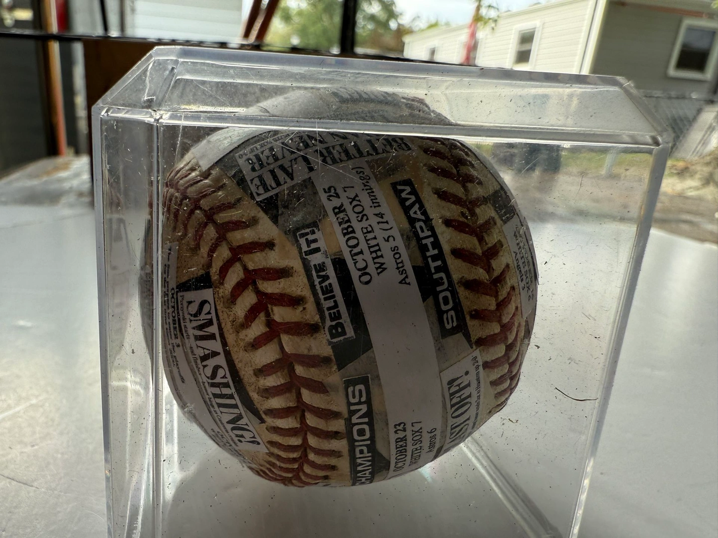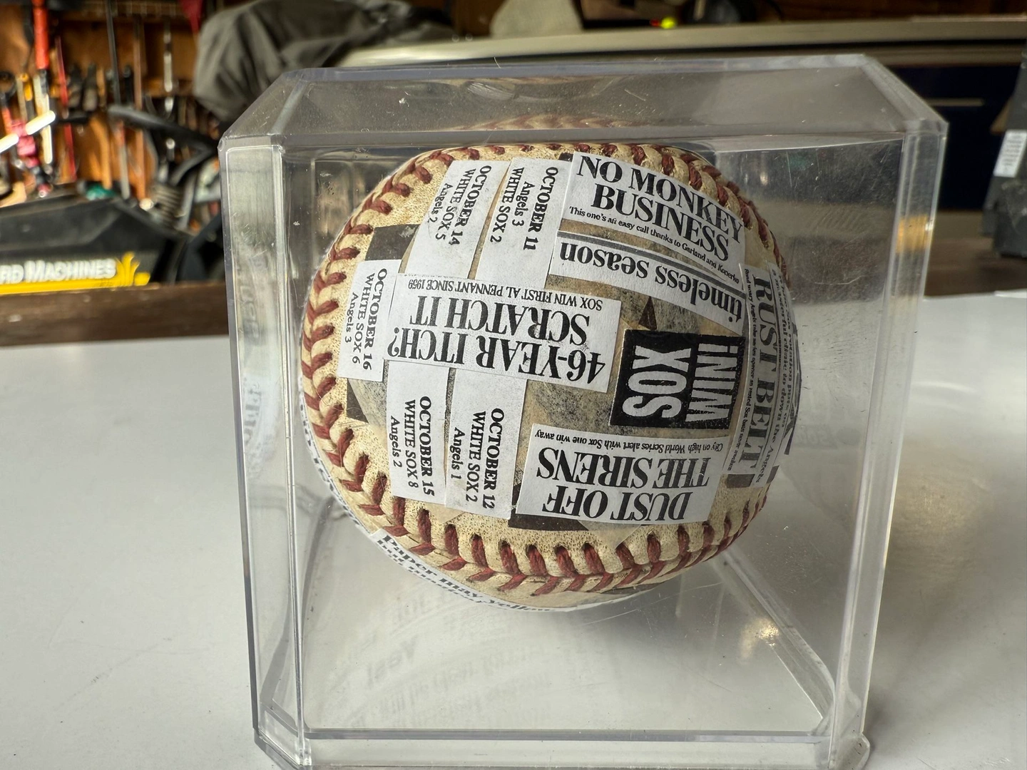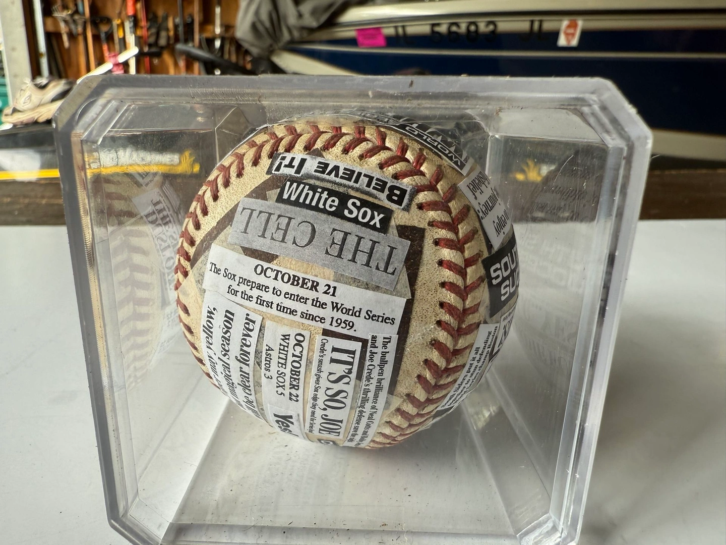 This is a commemorative baseball celebrating the Chicago White Sox winning the 2005 World Series. The ball is covered with newspaper clippings and headlines from the time of their victory. The Chicago White Sox won the World Series in 2005, defeating the Houston Astros. This was their first championship since 1917, ending an 88-year drought. The team was known for its dominant pitching rotation and won 11 of 12 playoff games. The baseball is a collectible item celebrating this historic moment for the team and its fans. Feel free to message if you have any questions!