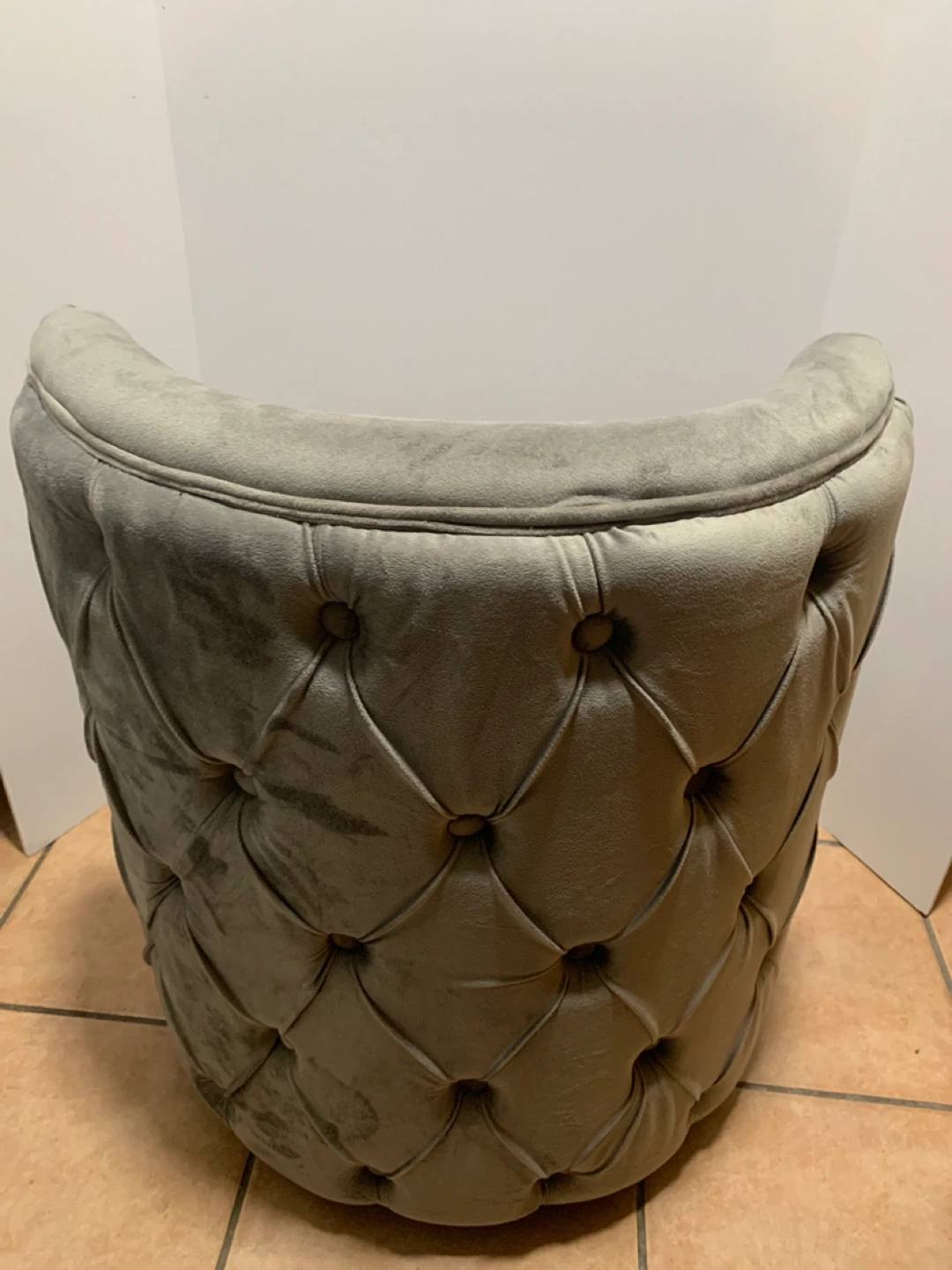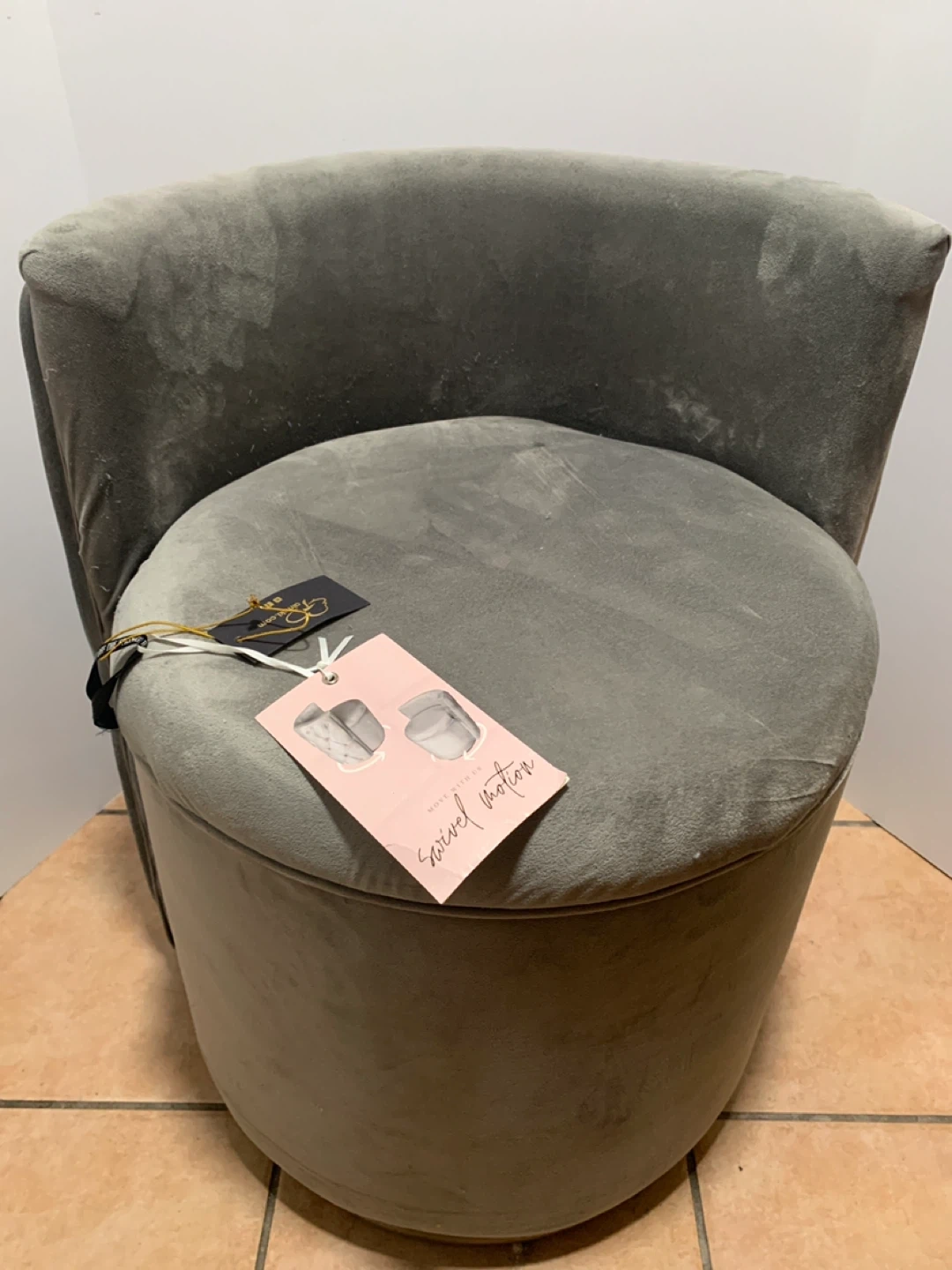 This plush grey velvet accent chair features a comfortable tufted back and a convenient swivel base. Its compact design makes it a great addition to any living space, bedroom, or vanity area. Upholstered in soft velvet.