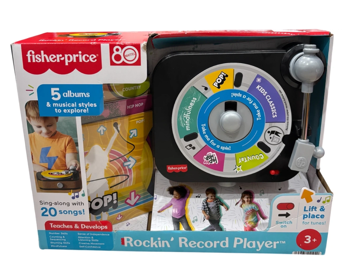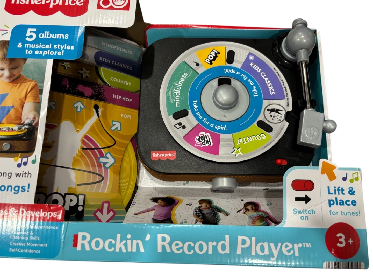 This Fisher-Price Rockin' Record Player lets little ones explore 5 musical styles and 20 songs. It features 4 albums to explore, including mindfulness, country, hip hop, and pop. Lift and place for tunes! It's designed for ages 3 and up.