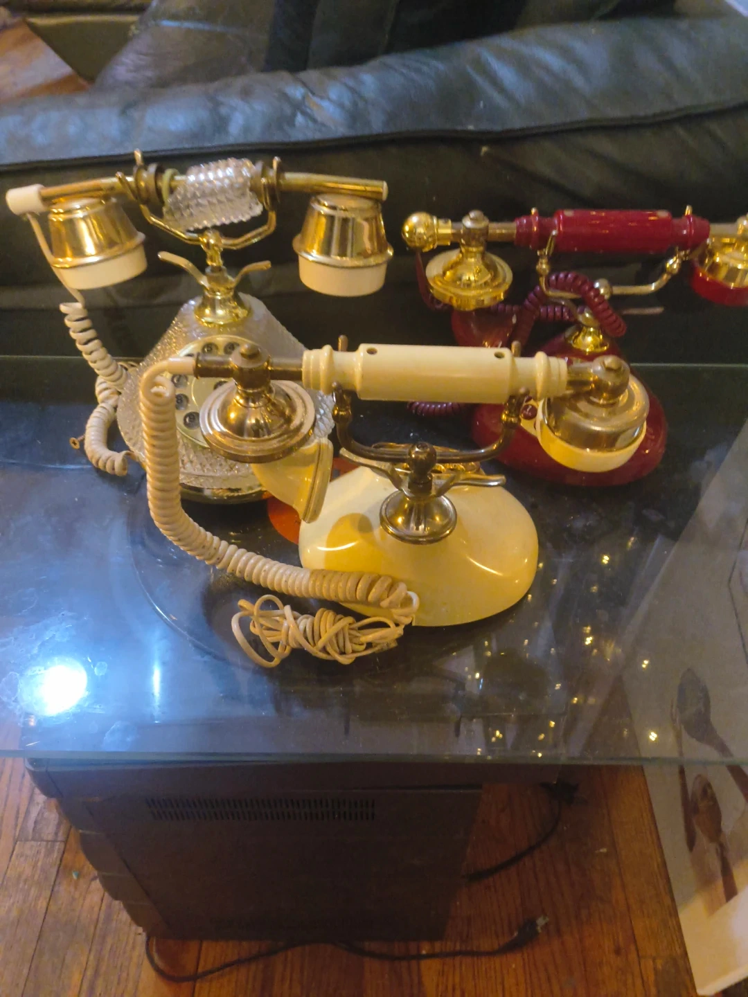Set of three decorative rotary dial telephones. Features include ornate gold-tone accents and classic corded handsets. Red, cream, and clear crystal designs are present.