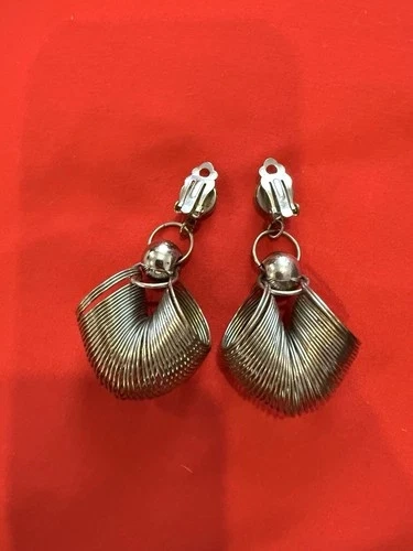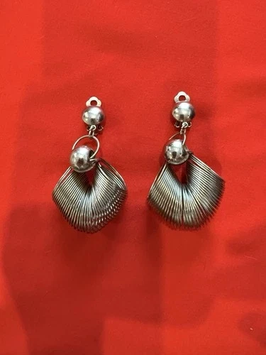 These vintage silver "Slinky" style dangle drop clip-on earrings are a unique addition to any woman's jewelry collection. They are perfect for adding a touch of whimsy to any outfit. The clip-on closure makes them easy to wear, and the dangle/drop style adds movement and interest to the ear. These earrings are sure to make a fashion statement.