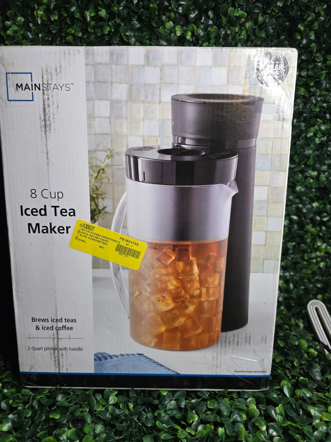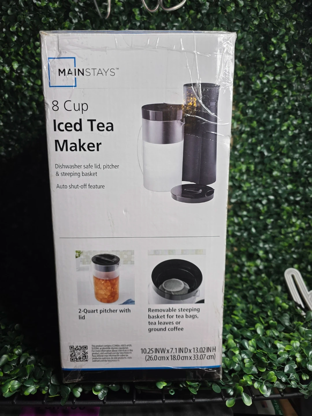 This Mainstays 8 cup iced tea maker includes a 2-quart pitcher with handle and a removable steeping basket for tea bags or coffee grounds. It's dishwasher safe and has an auto shut-off feature. Unit dimensions are 10.25" W x 7.1" D x 13.02" H.