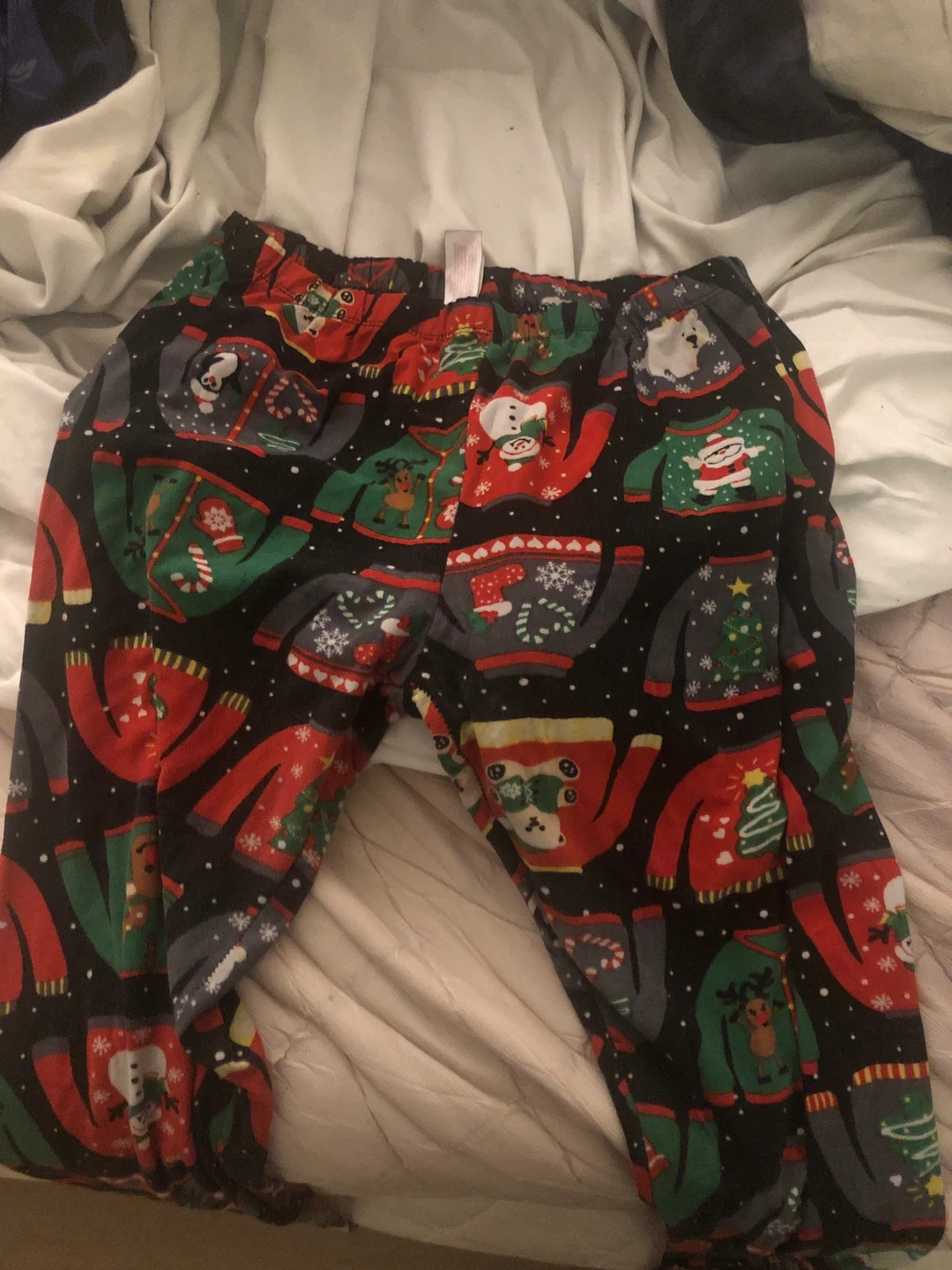 These pajama pants feature a fun, all-over print of ugly Christmas sweaters with various holiday characters like Santa, penguins, and reindeer. Elastic waistband for comfort. Perfect for lounging during the holiday season!