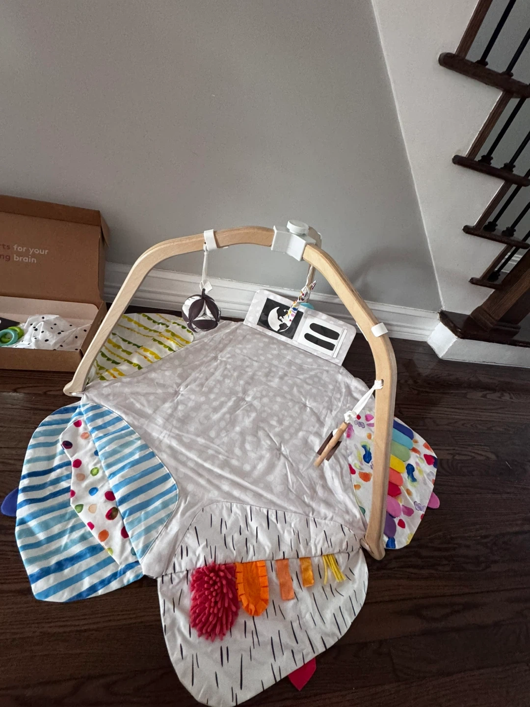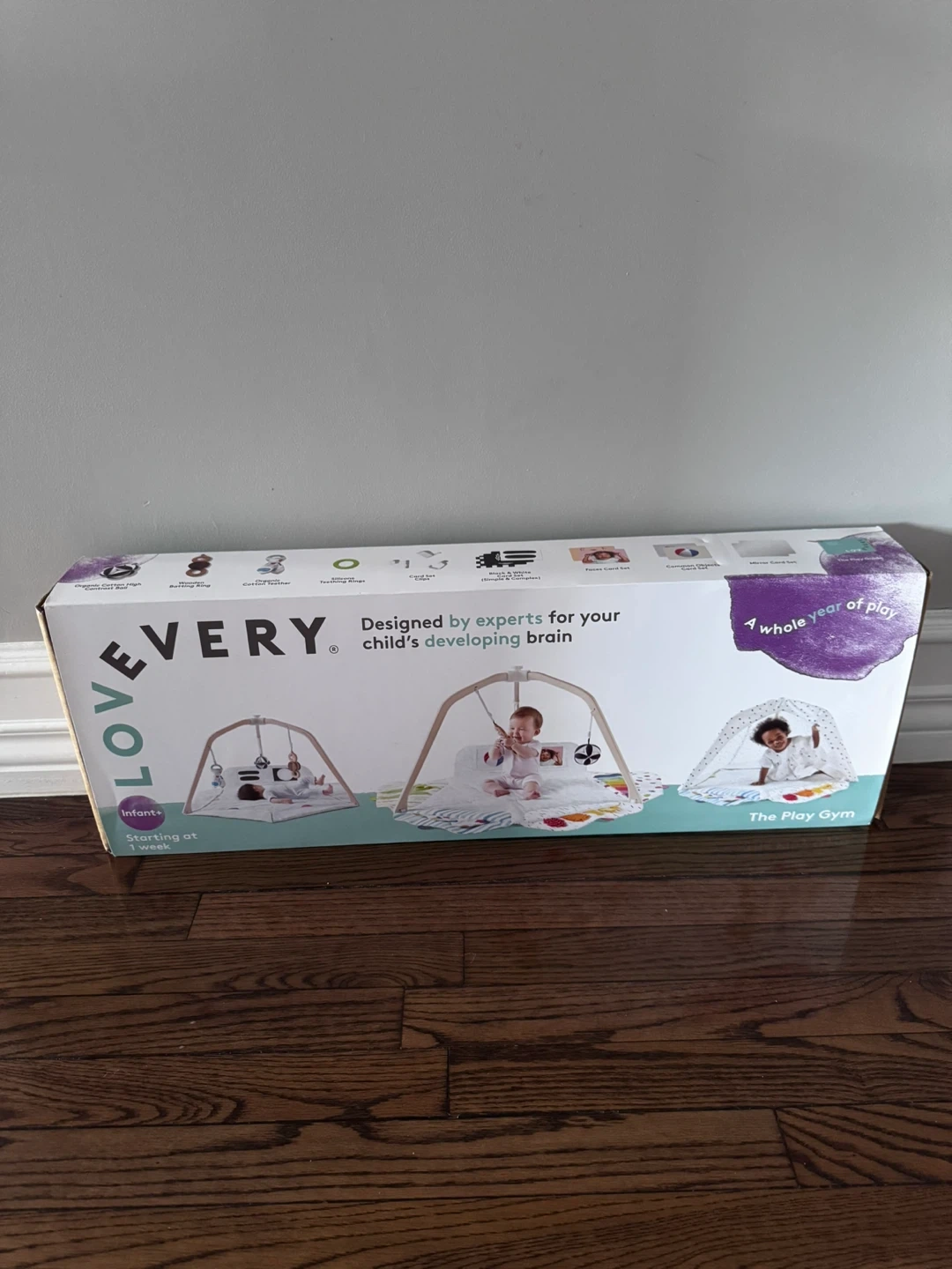 This Lovevery Play Gym is designed by experts for your child's developing brain. It's suitable for infants starting at 1 week old. The play gym comes with multiple attachments for engaging baby's senses. It's a whole year of play!