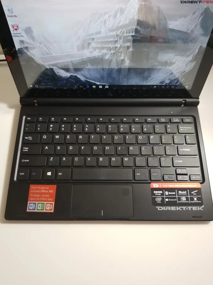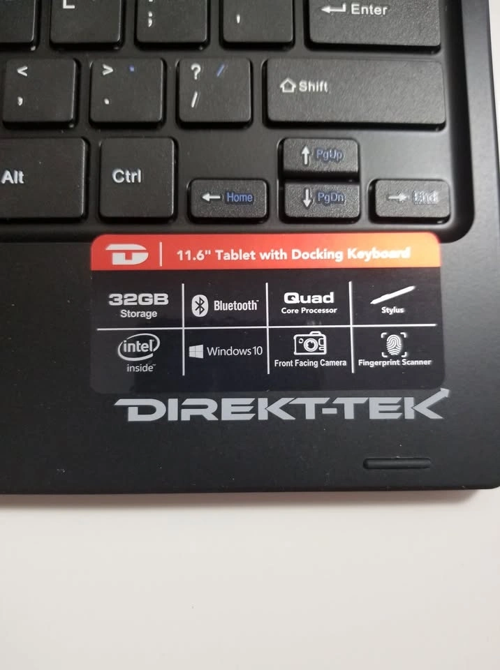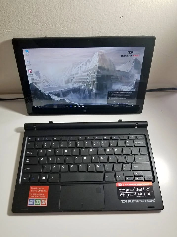 Direkt-Tek 11.6" Convertible Touchscreen Laptop / Tablet, Windows 10 Home. Perfect for students or anyone needing a portable Windows device. It's a 2-in-1 that converts between laptop and tablet modes. Features an 11.6" IPS screen with 1920 x 1080 resolution, 32GB storage, 2GB memory, a micro SD slot, USB port, front and rear cameras, Bluetooth, Wi-Fi, a fingerprint reader, and a docking keyboard. Looks and works great! Feel free to message if you have any questions!