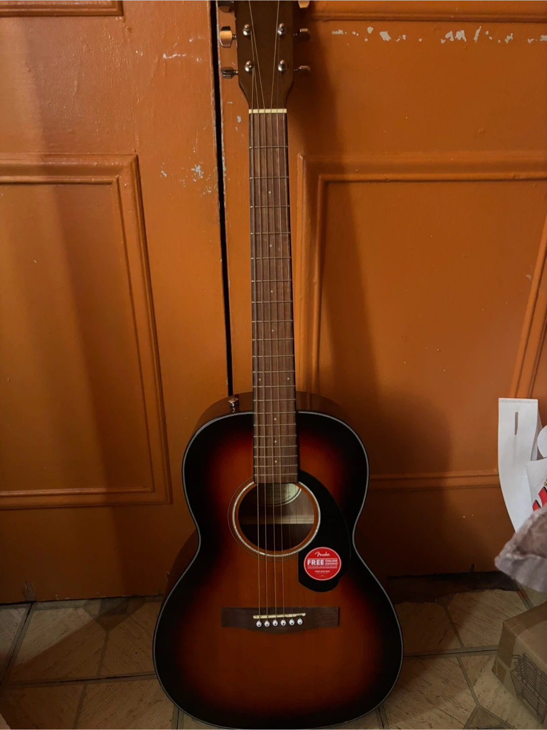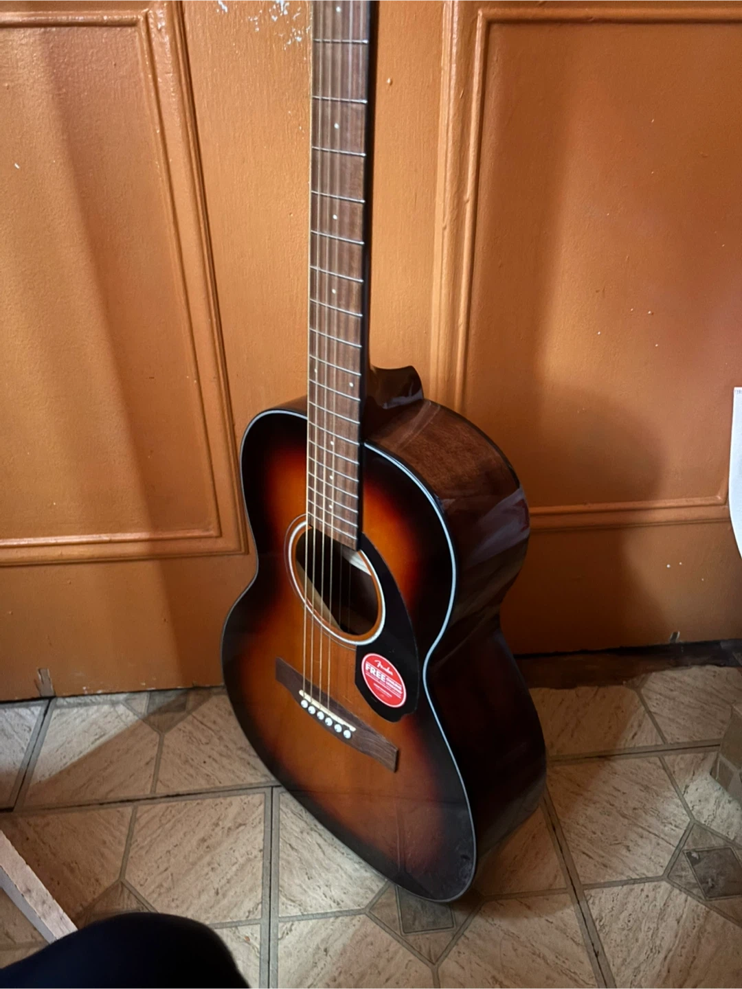 This is a Fender acoustic guitar in a sunburst finish. It has a comfortable body size for playing. A great instrument for beginners and experienced players alike!
