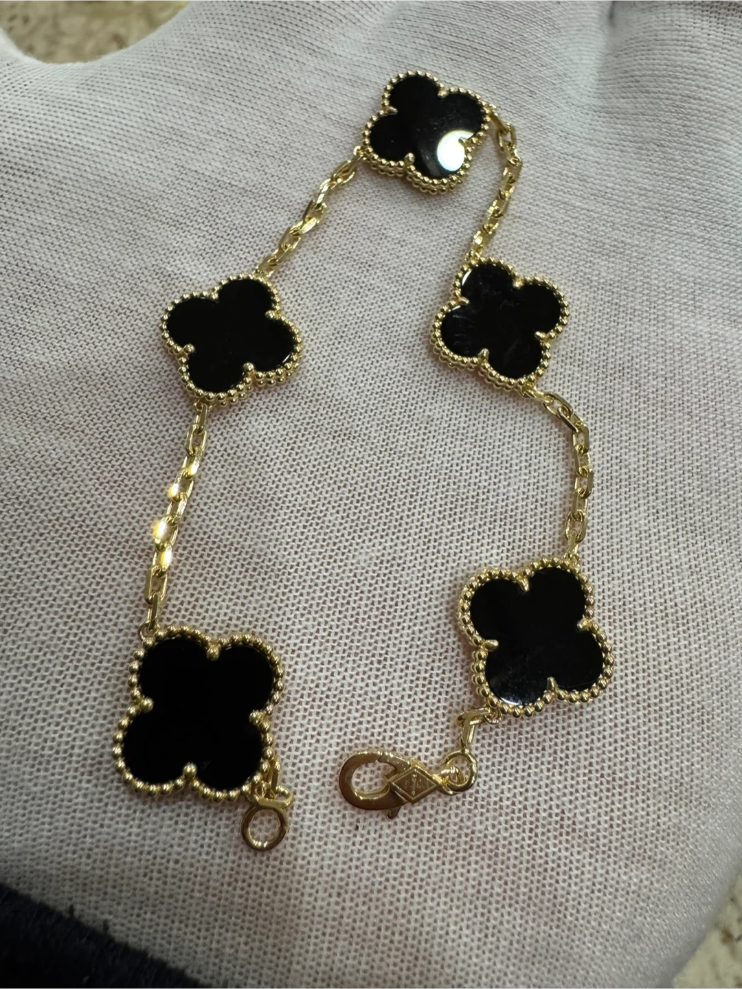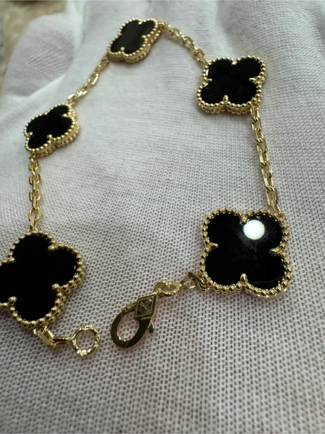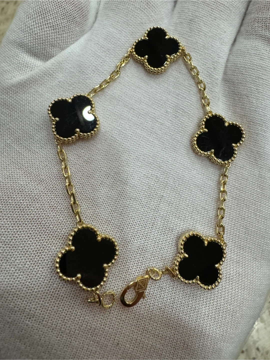 This Van Cleef & Arpels bracelet features five black onyx four-leaf clover motifs connected by a yellow gold chain. It has a secure lobster clasp closure. A beautiful statement piece!