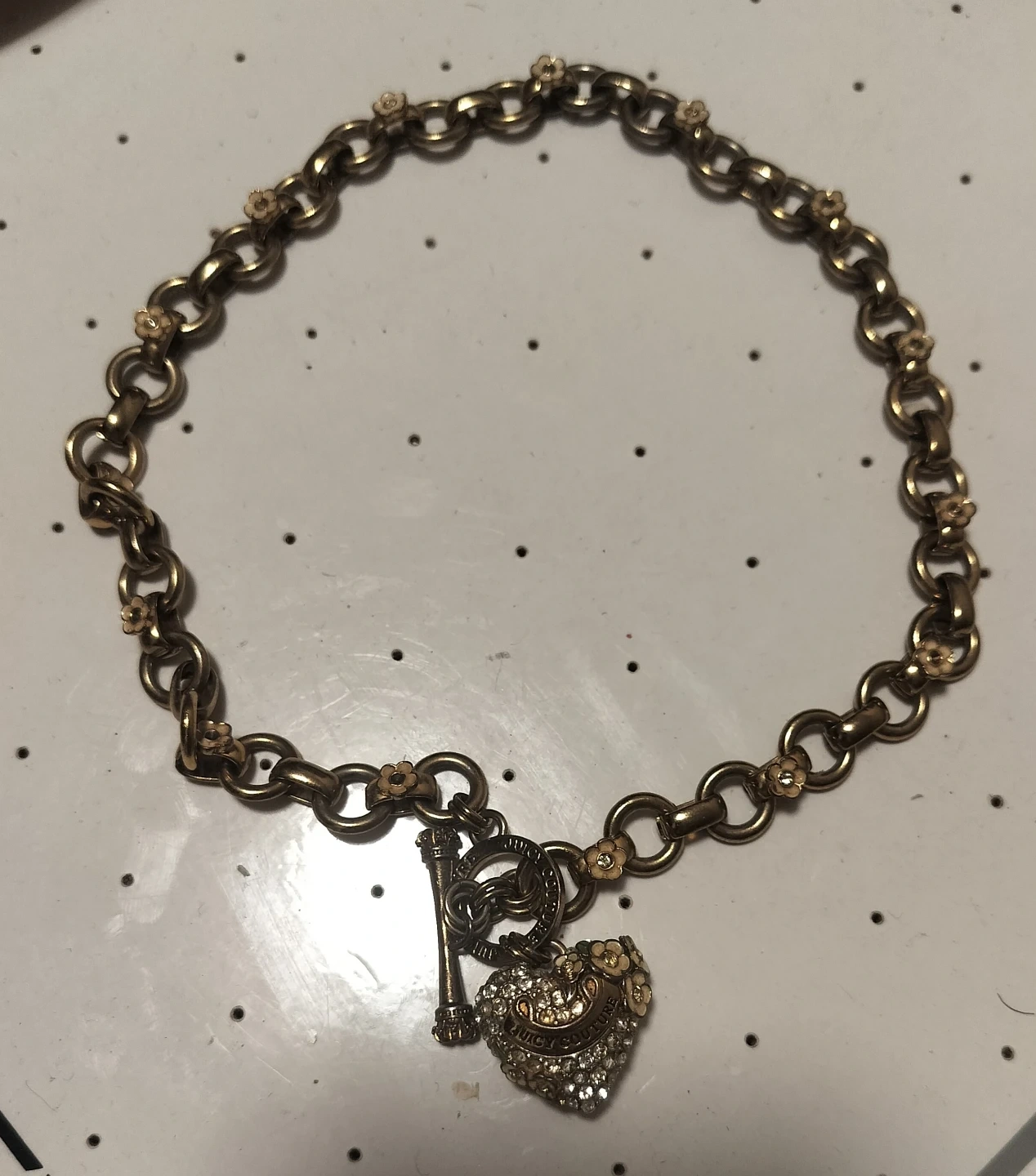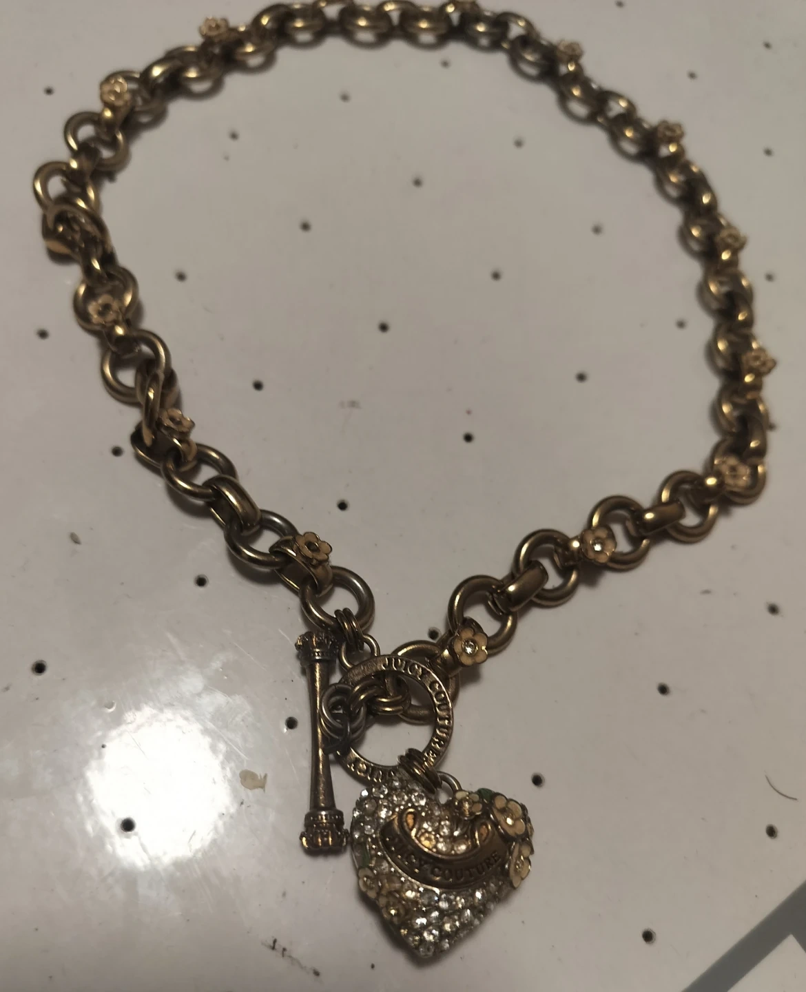 This Juicy Couture necklace features a toggle clasp and a heart-shaped charm adorned with rhinestones and floral details. The chain has small flower accents throughout. It's a statement piece for any jewelry collection!Missing some rhinestones,sold as is,open to offers