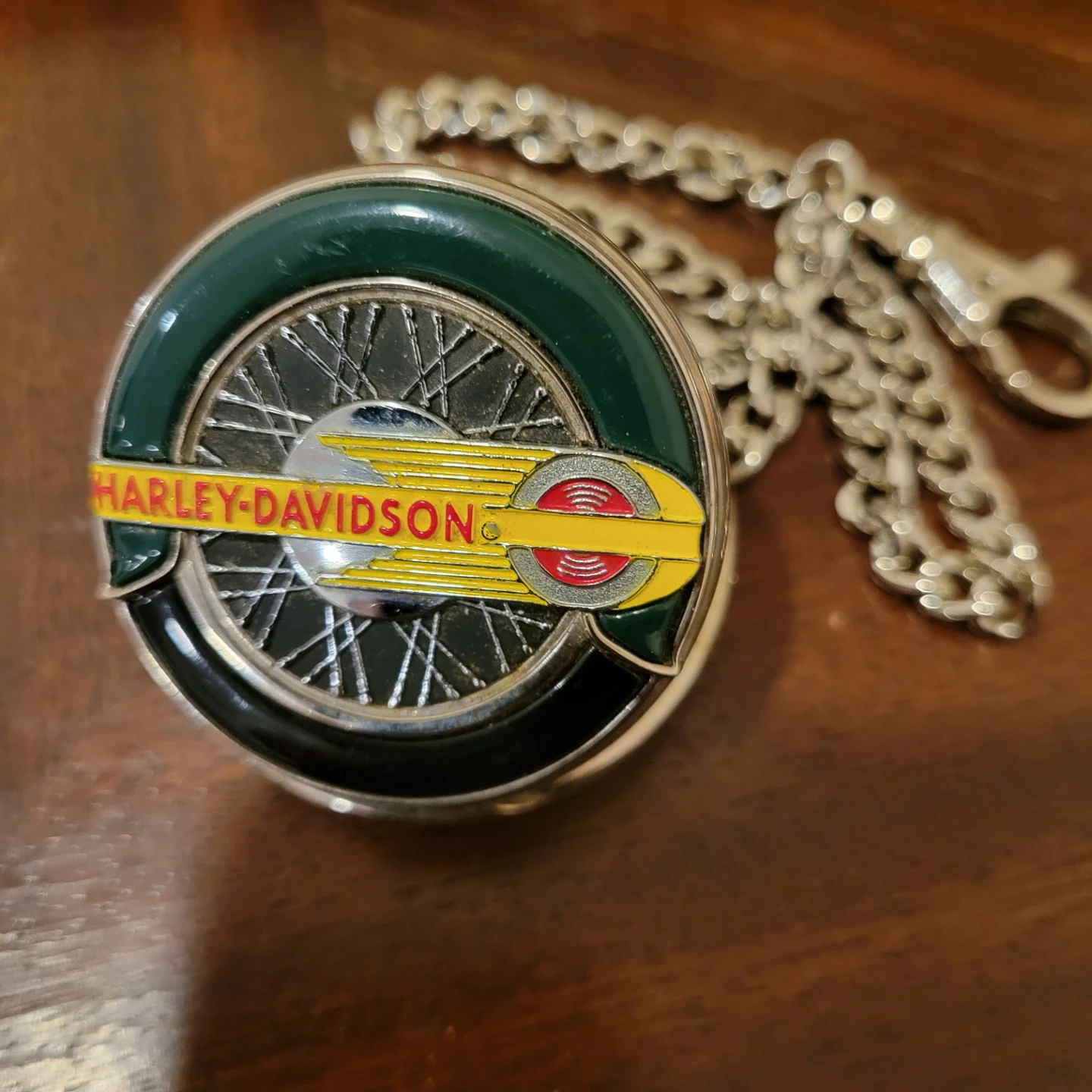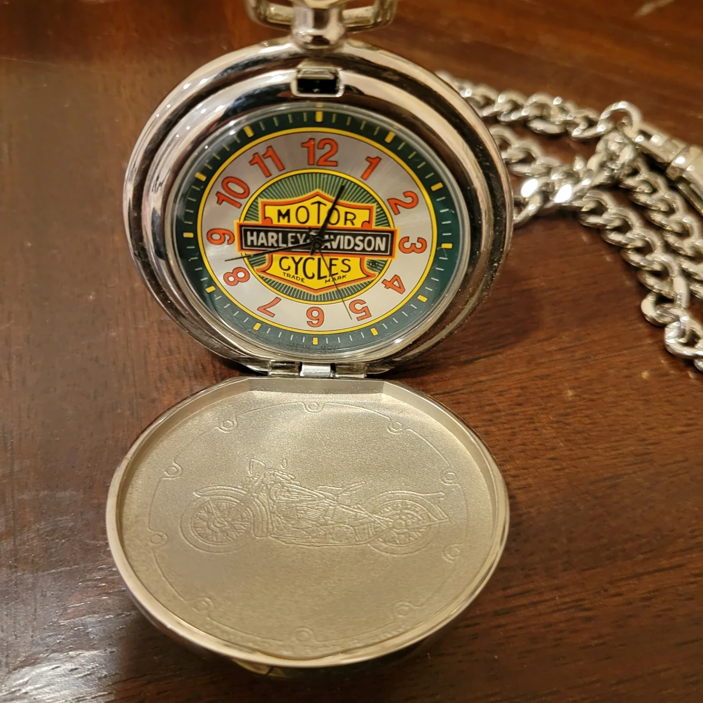 This is a Harley-Davidson pocket watch with a chain. It features the iconic Harley-Davidson logo on the face and a motorcycle design inside the lid. A great accessory for any Harley enthusiast!