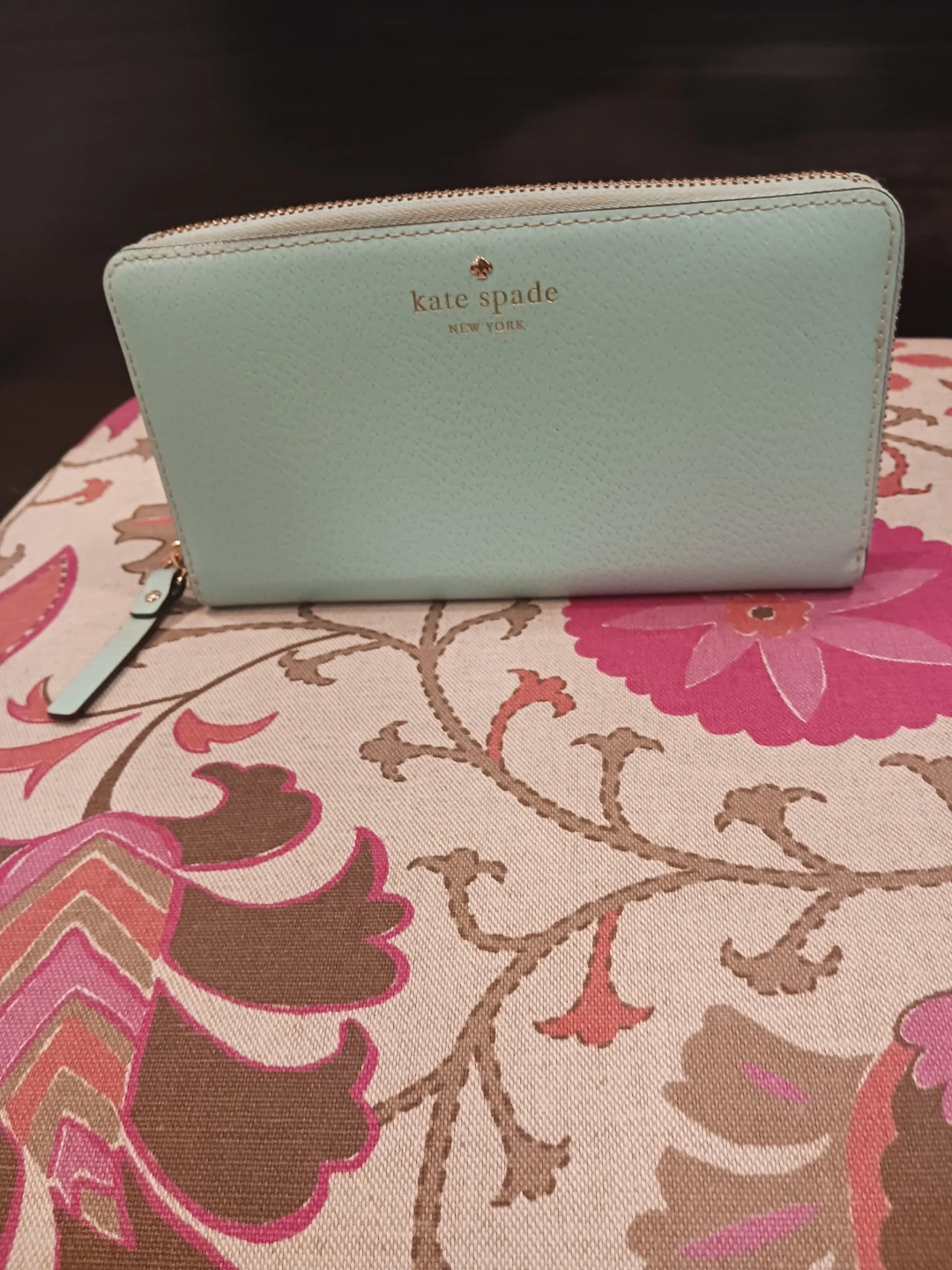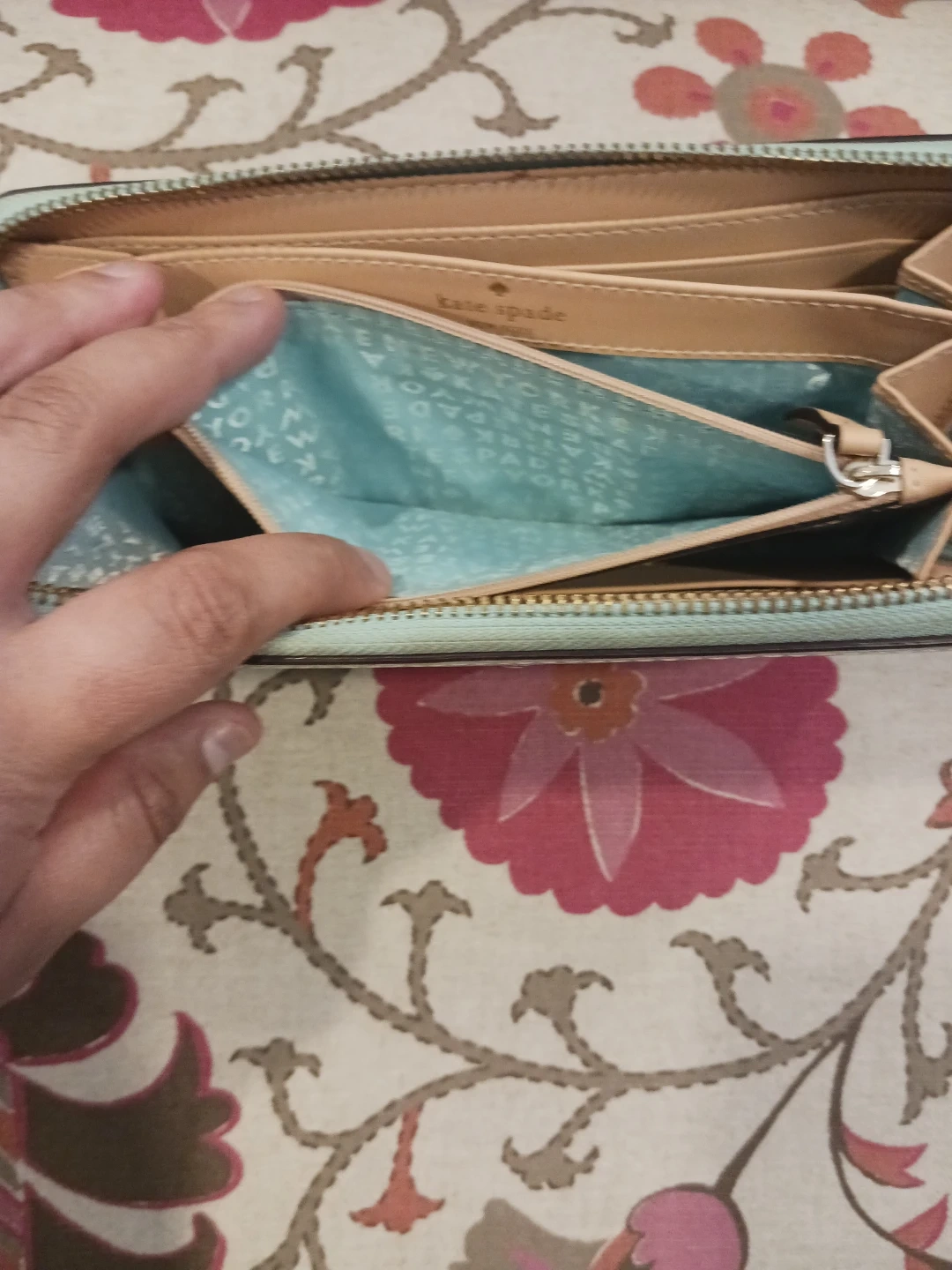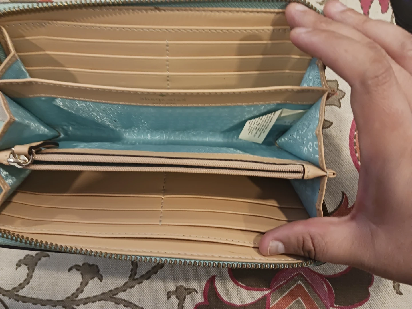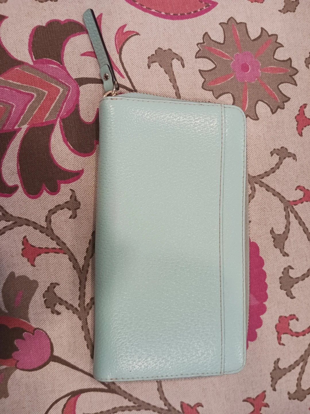 This is a Kate Spade zip-around wallet. It's a light blue pebbled leather exterior with a tan interior. Plenty of card slots and compartments for your essentials!