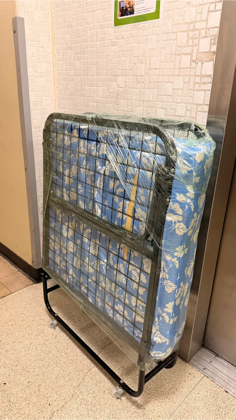 Selling a folding rollaway bed featuring a blue floral pattern. It's wrapped and ready to go! Perfect for guests or small spaces.