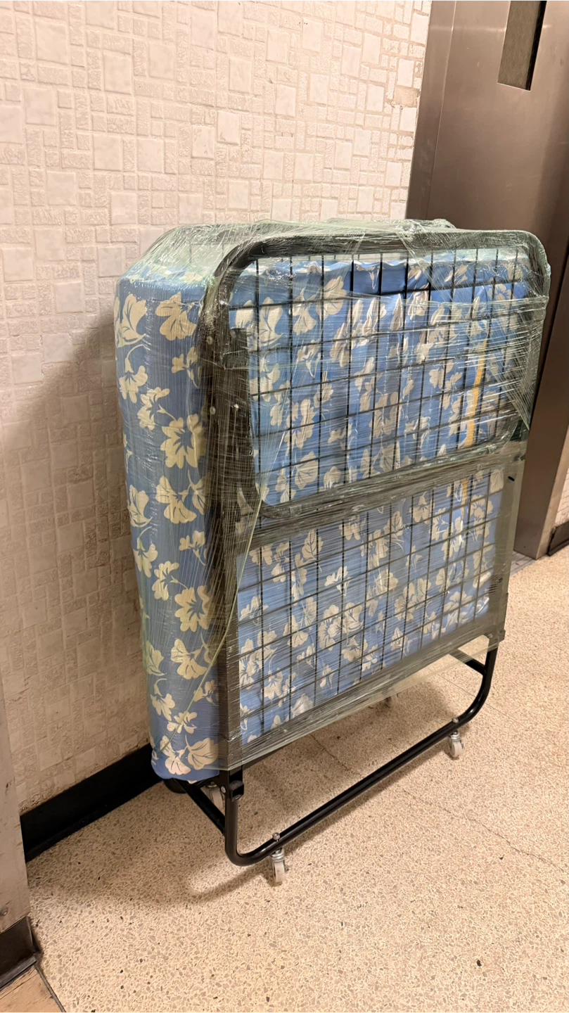 Selling a folding rollaway bed featuring a blue floral pattern. It's wrapped and ready to go! Perfect for guests or small spaces.