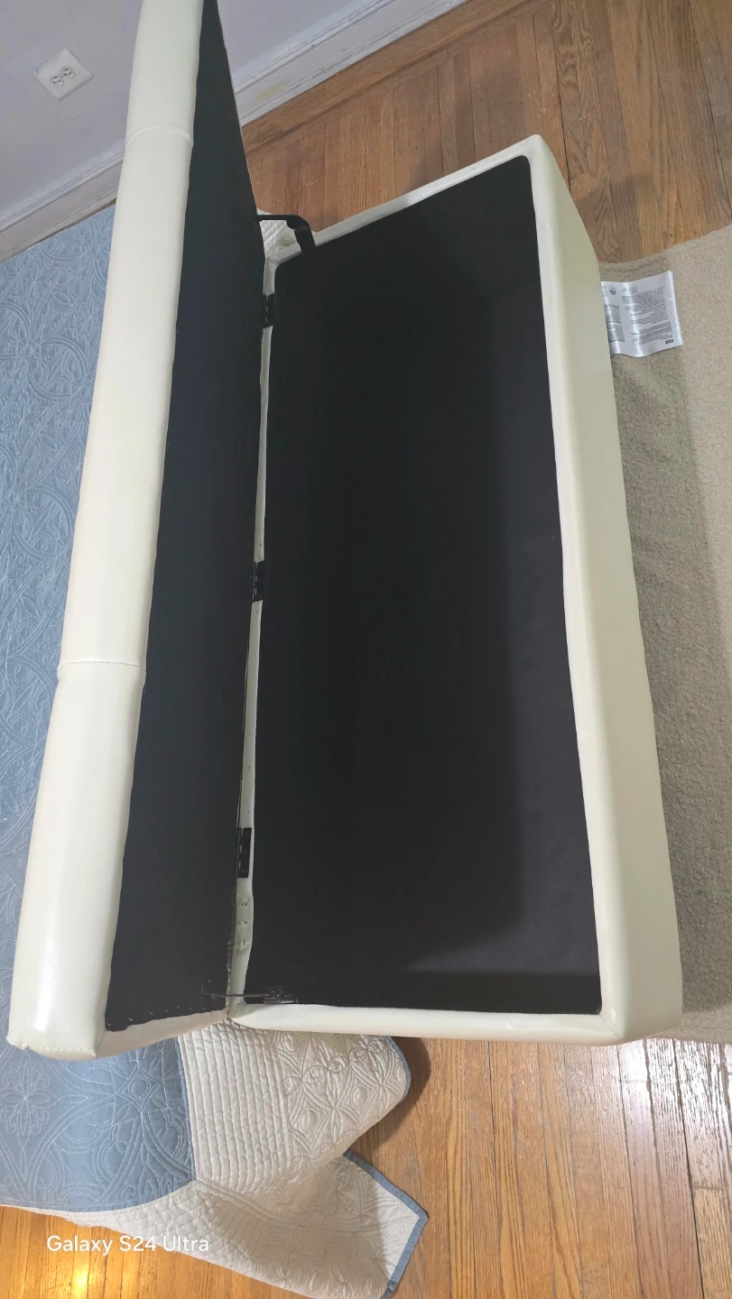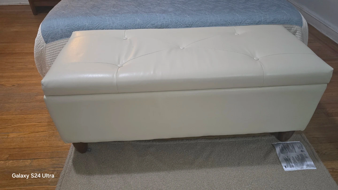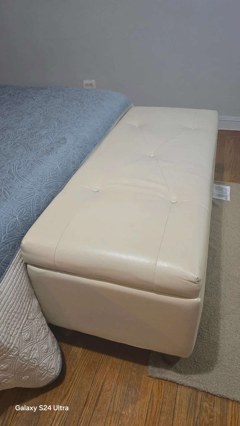 This storage ottoman bench offers a tufted cream-colored exterior. It's perfect for stashing blankets or other items. The interior is lined in black fabric. You have to make arragement to pick up at my home. Able to confirm identity as well.