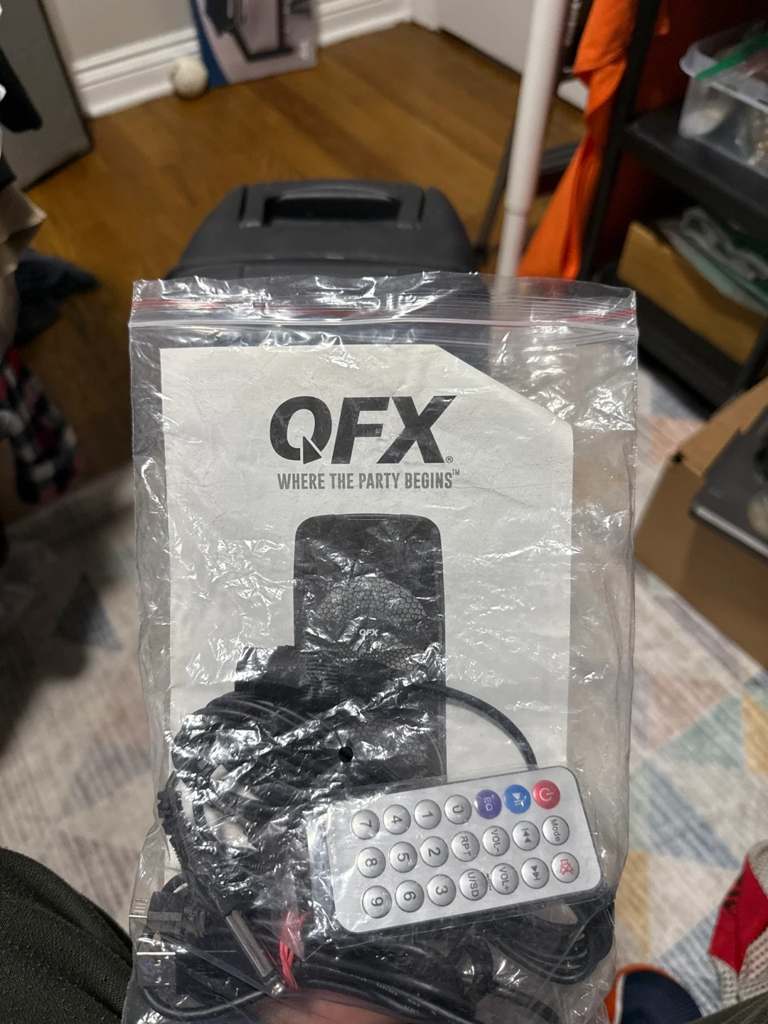 QFX portable speaker with dual 15-inch woofers and LED lights. Includes remote control, charging cable, and manual. It's perfect for parties and events! Offers Bluetooth, AUX, USB, and TF card connectivity.