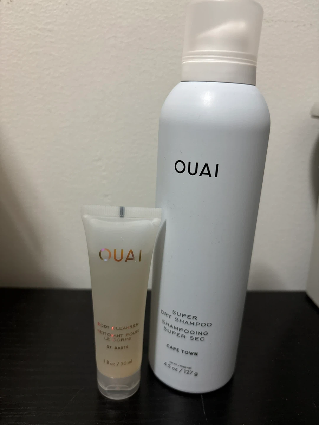 This set includes OUAI Super Dry Shampoo in Cape Town scent and a 1 fl oz / 30ml OUAI Body Cleanser in St. Barts. The dry shampoo is 4.5 oz / 127g. It's great for travel or trying out new scents!