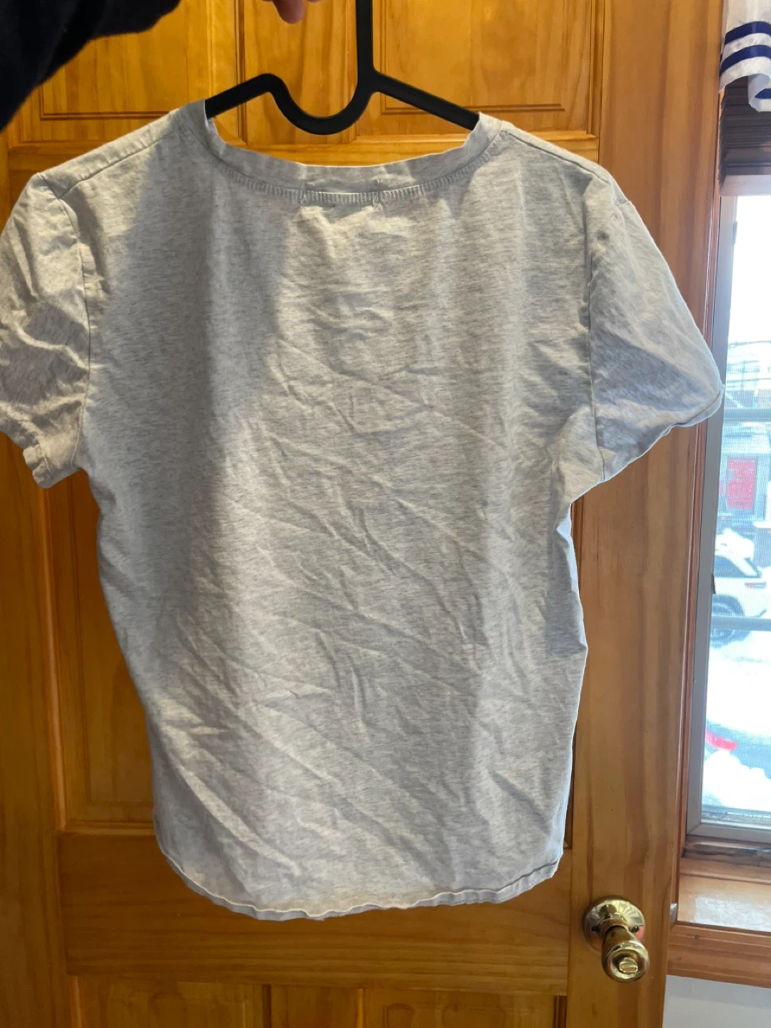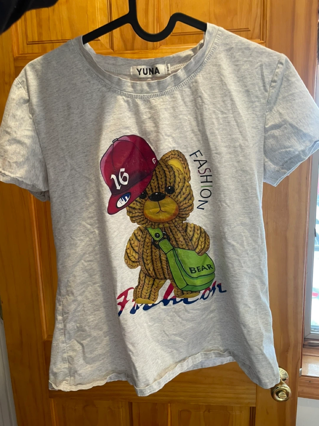 Light gray t-shirt with a "Fashion Bear" graphic on the front. This tee features a cartoon bear wearing a red baseball cap and a green crossbody bag. Cotton blend fabric. Crew neck, short sleeves.