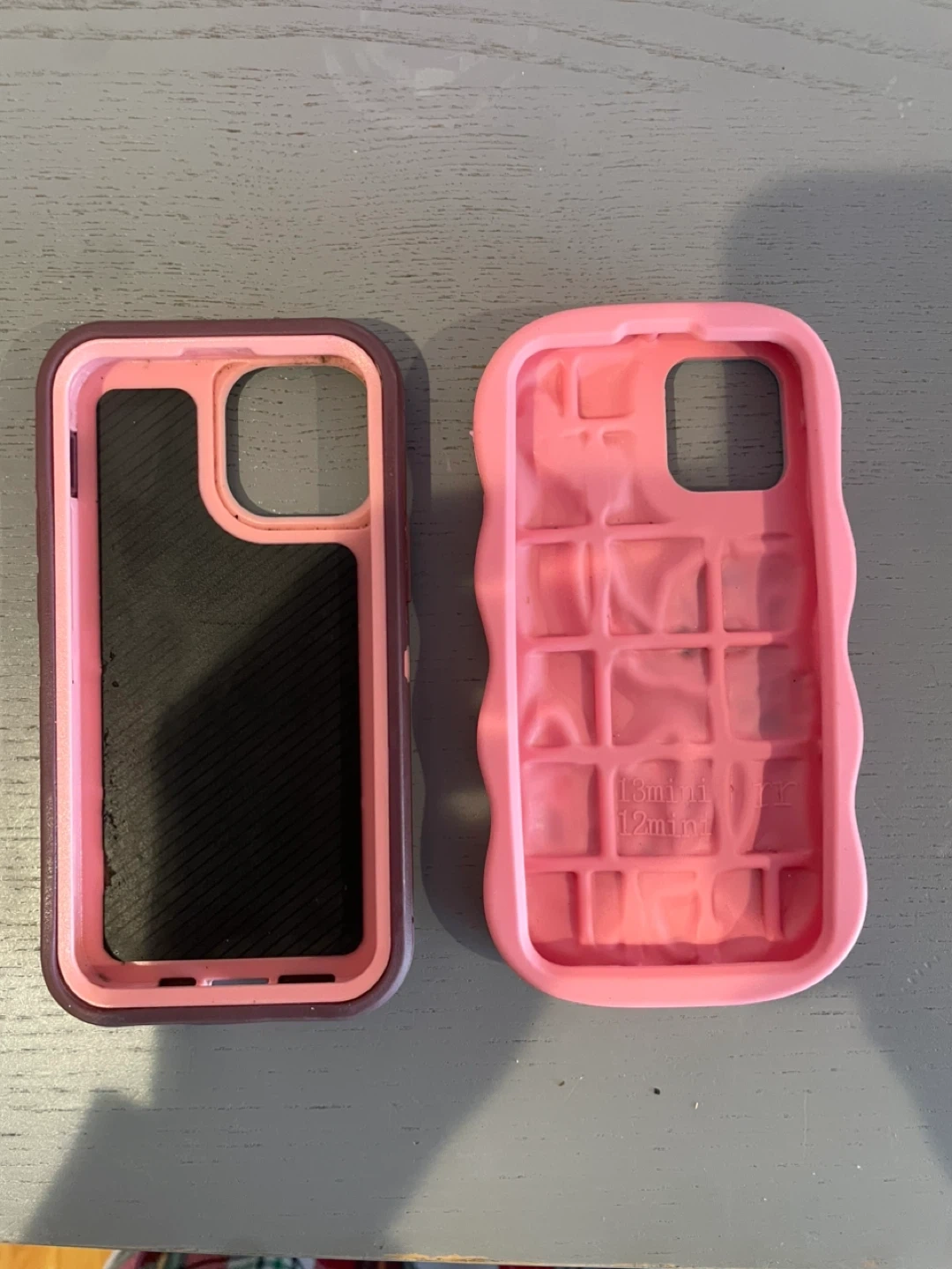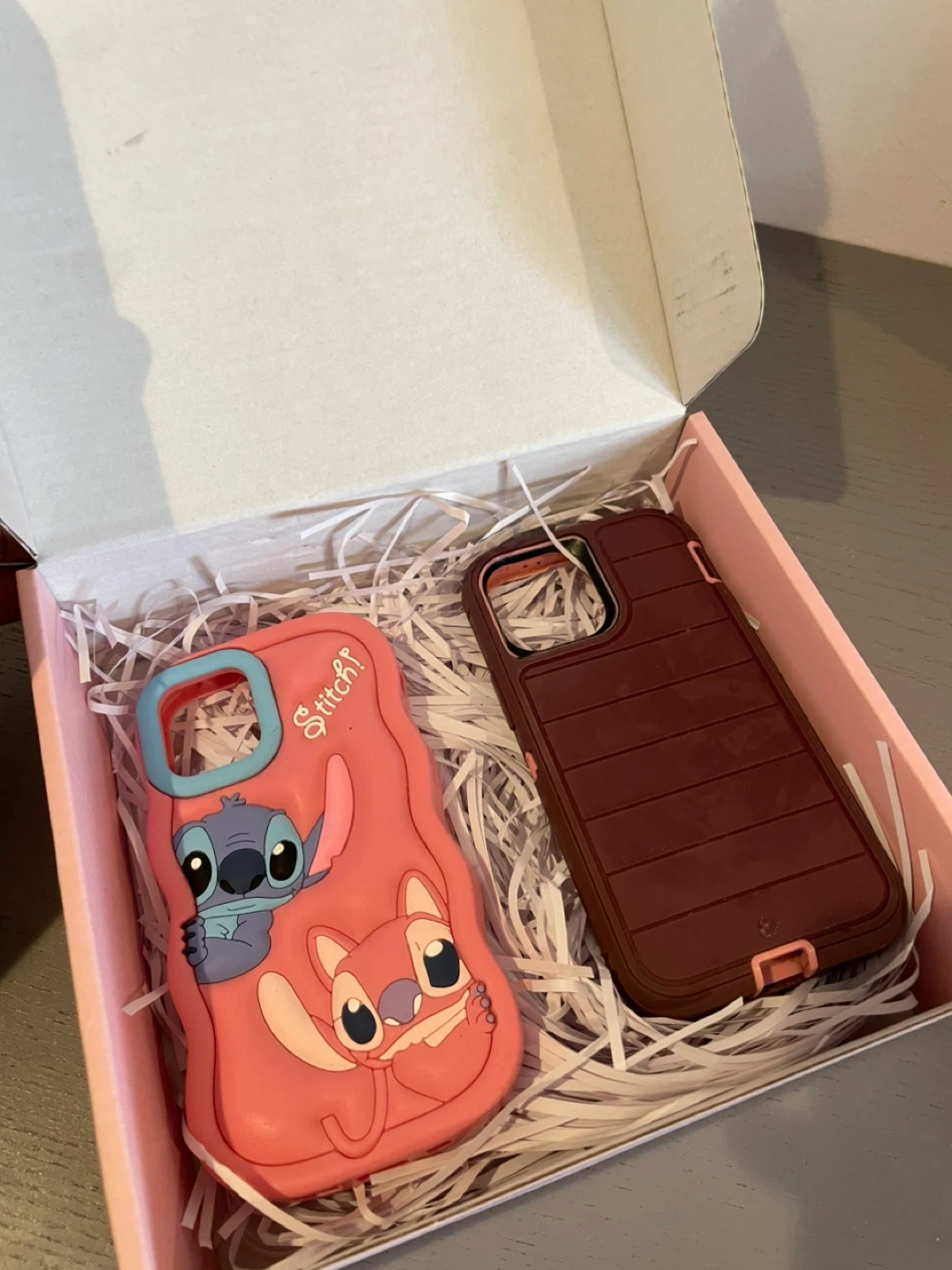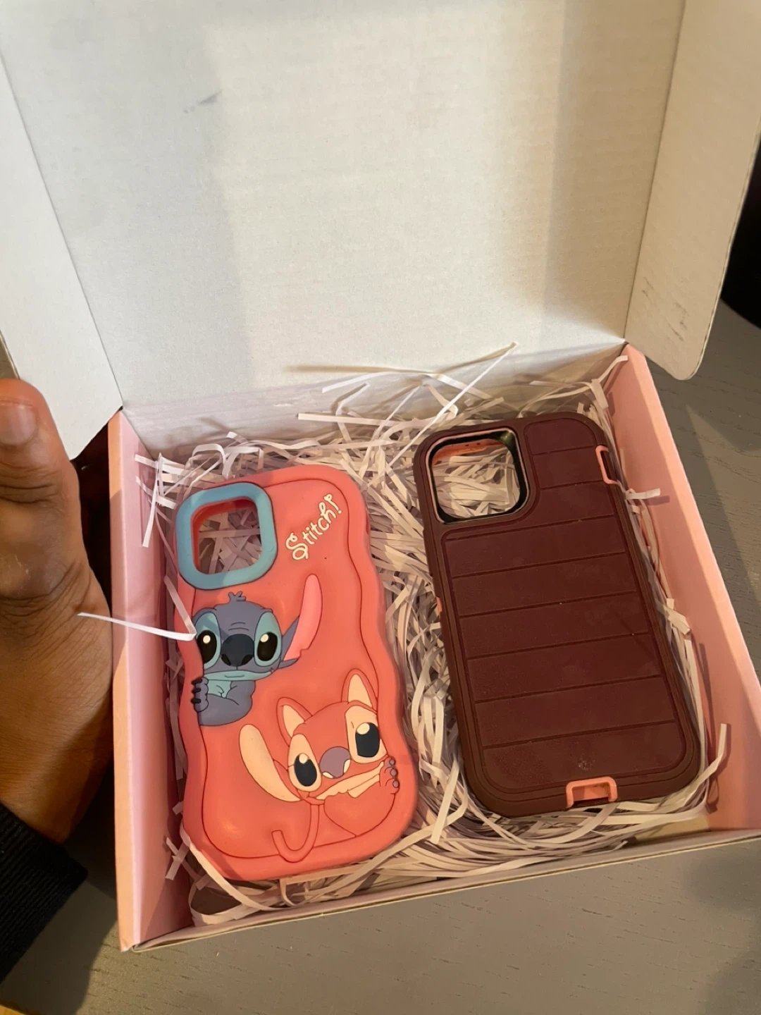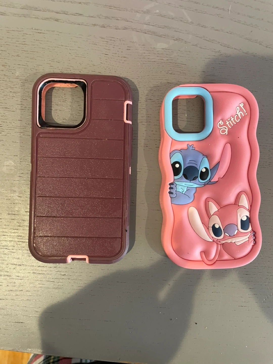 Includes two phone cases for iPhone 12 Mini. One features a pink design with Stitch and Angel characters, and the other is a maroon protective case. Both are made of durable materials.