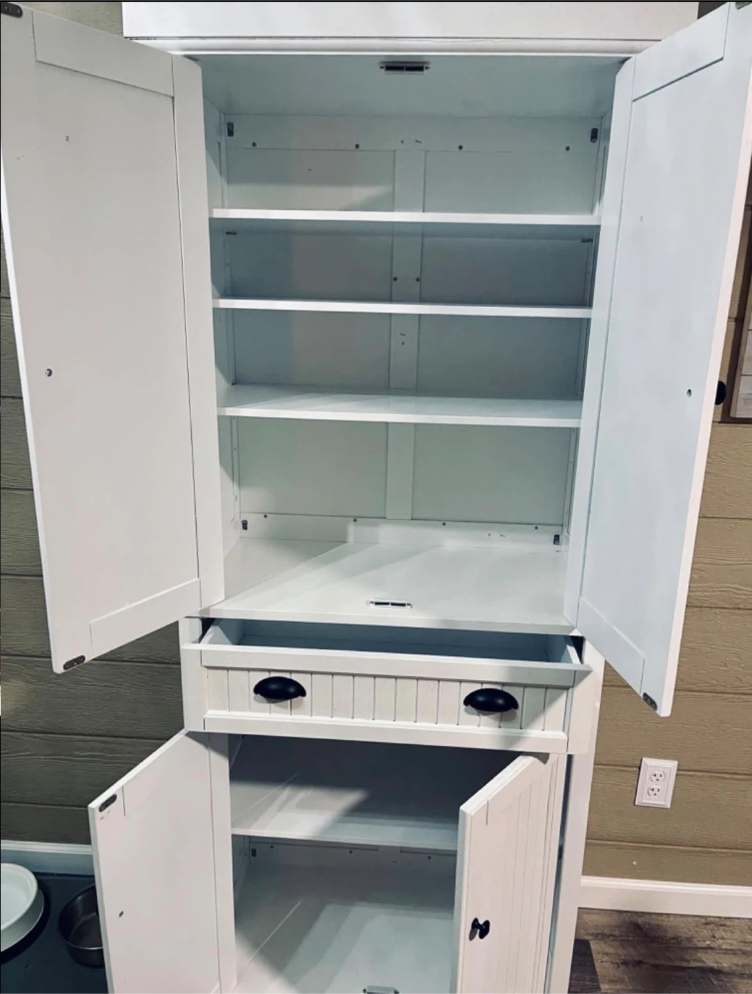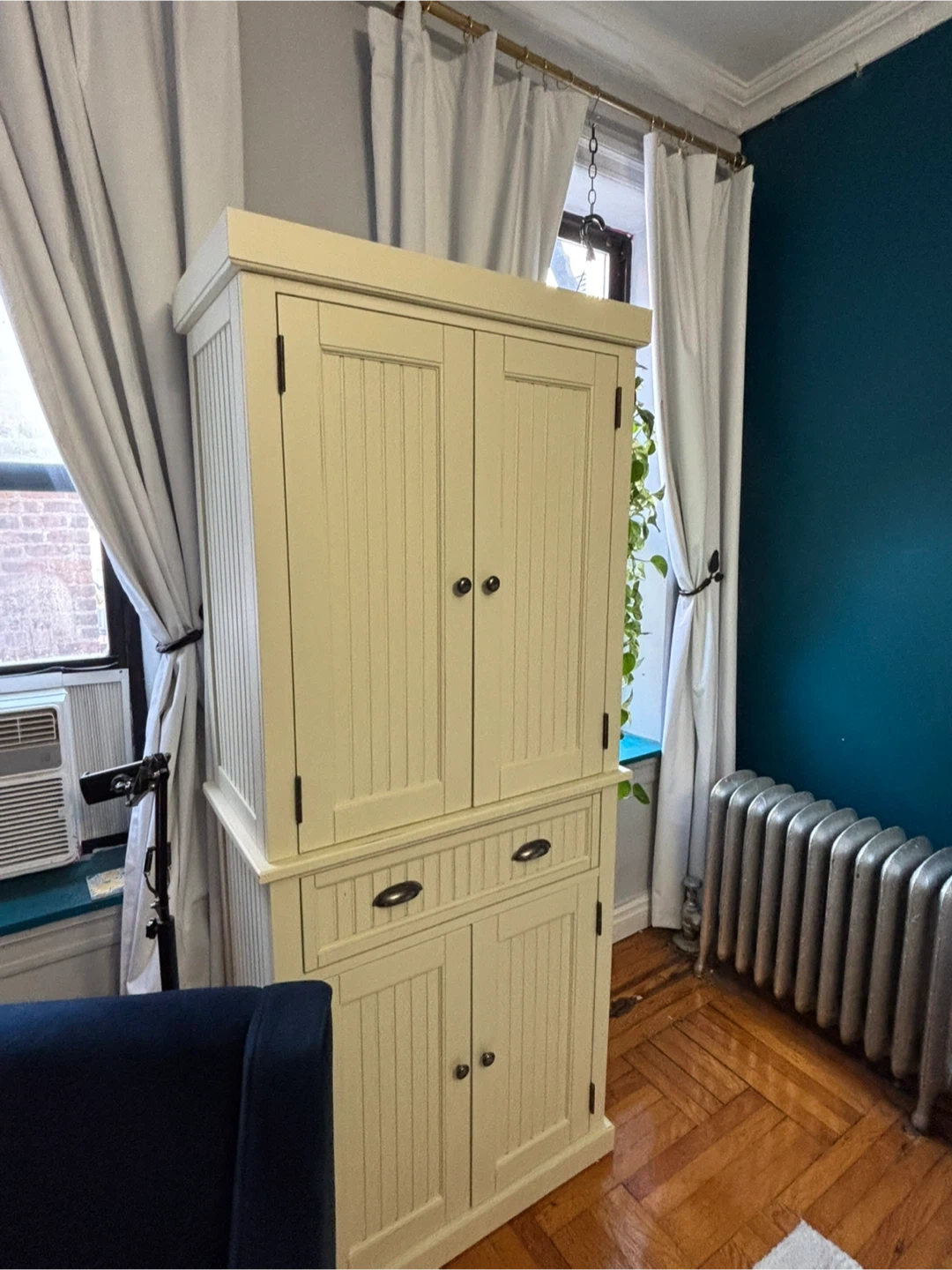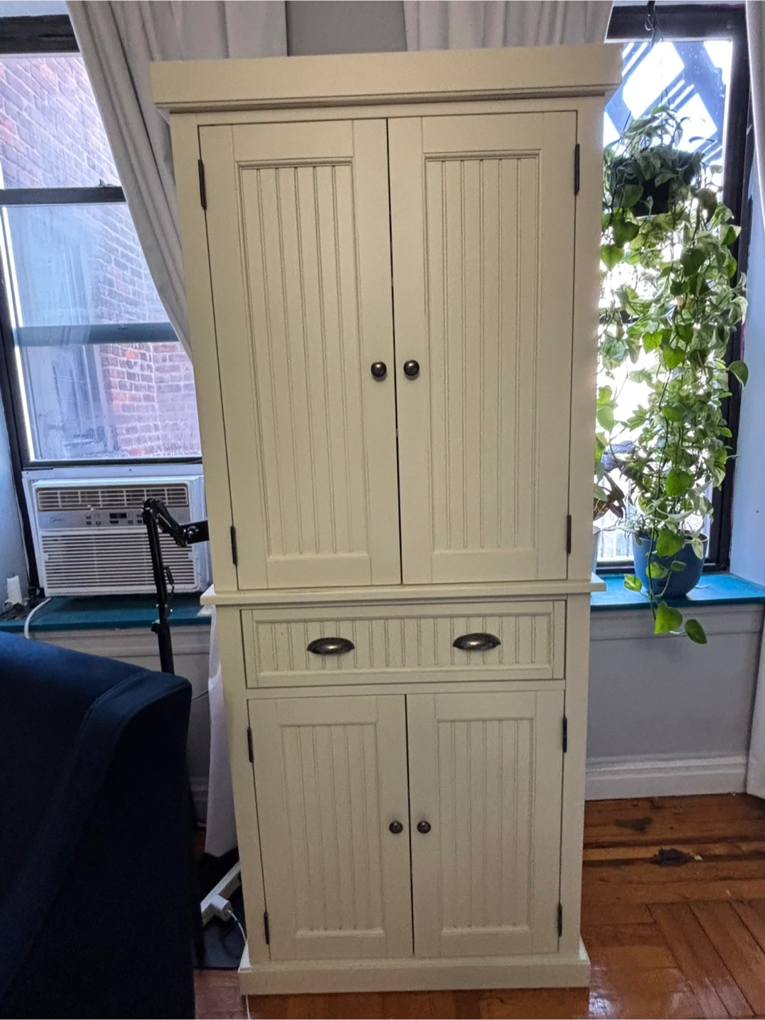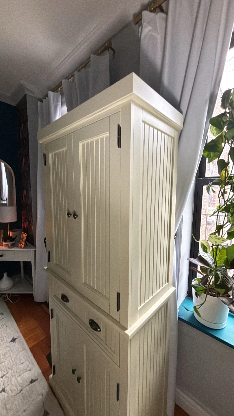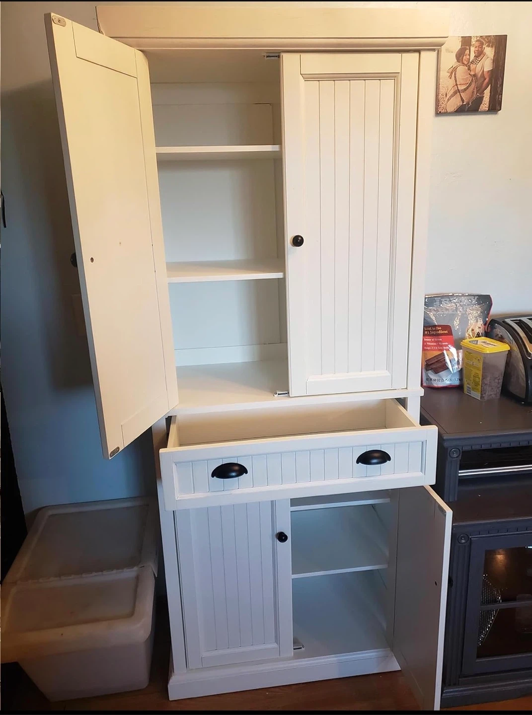 This tall white storage cabinet offers ample shelving behind double doors. It features a drawer and a lower cabinet with more shelving. It's a versatile piece for organizing any room! If transporting, it is a challenge, I am more than happy to disassemble for easy transport.