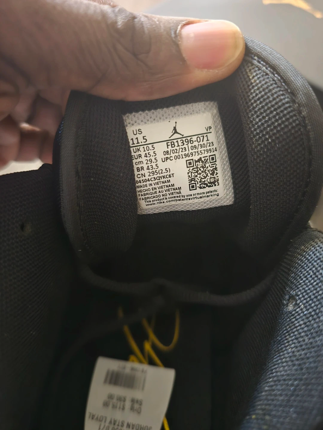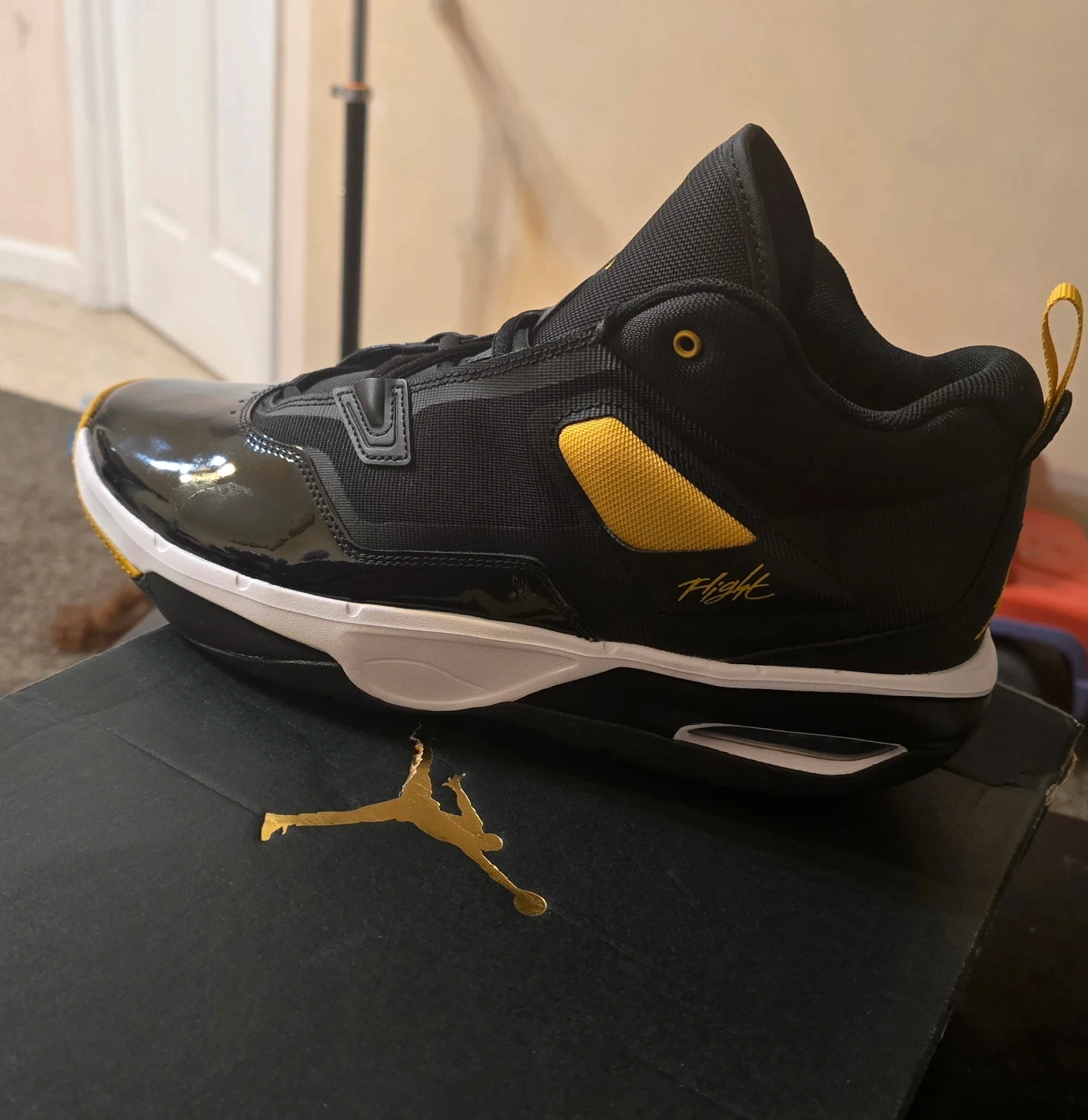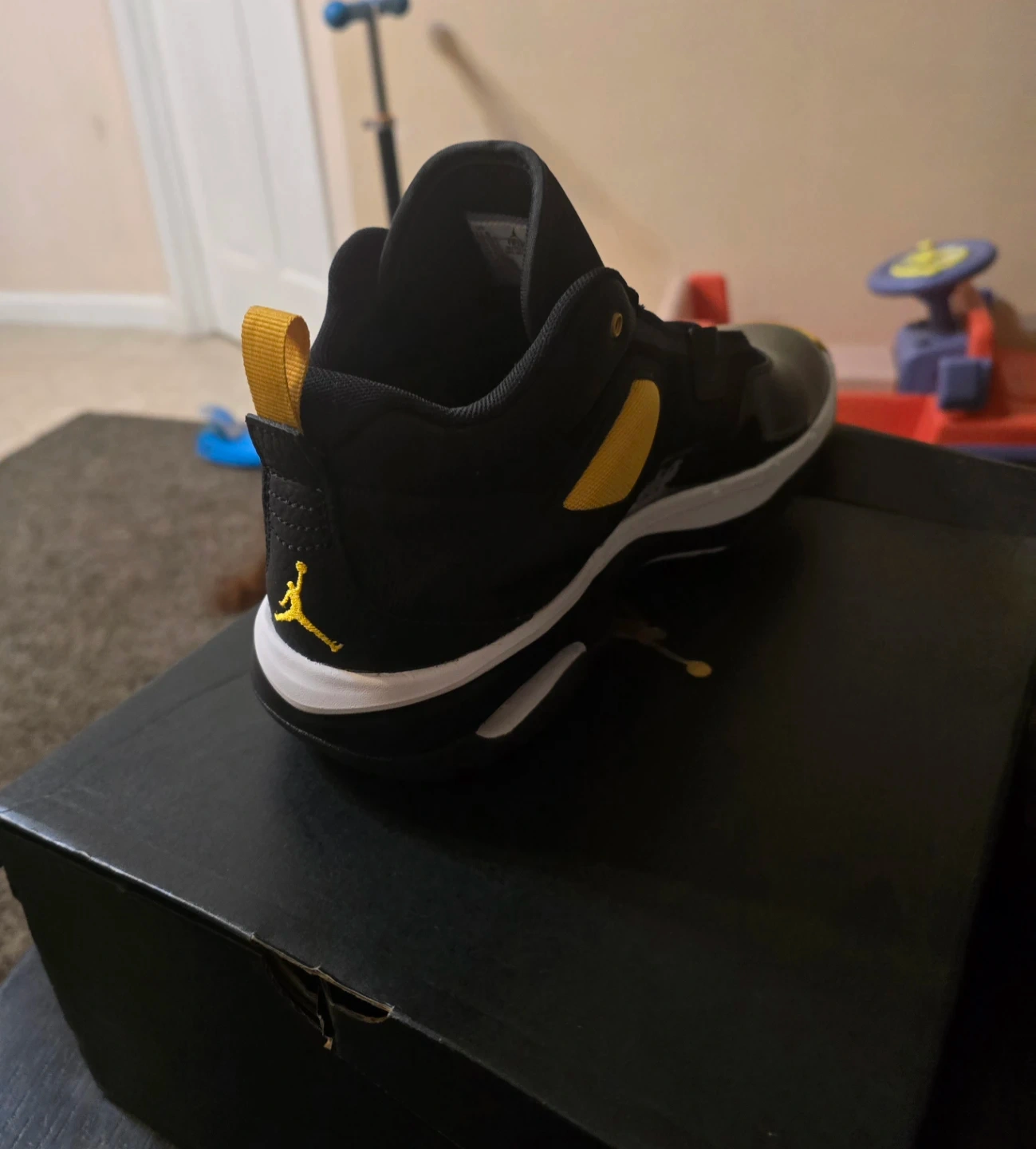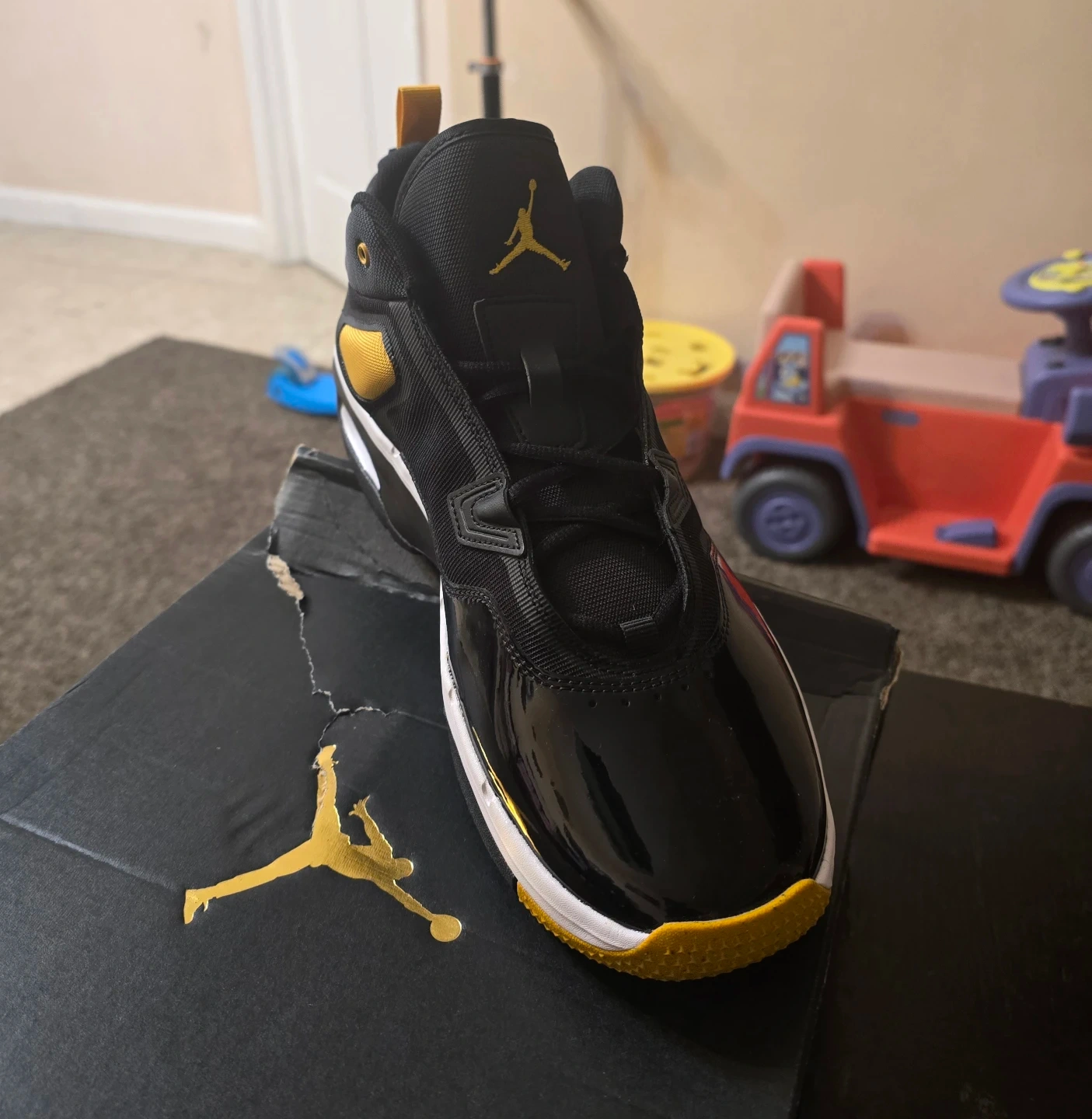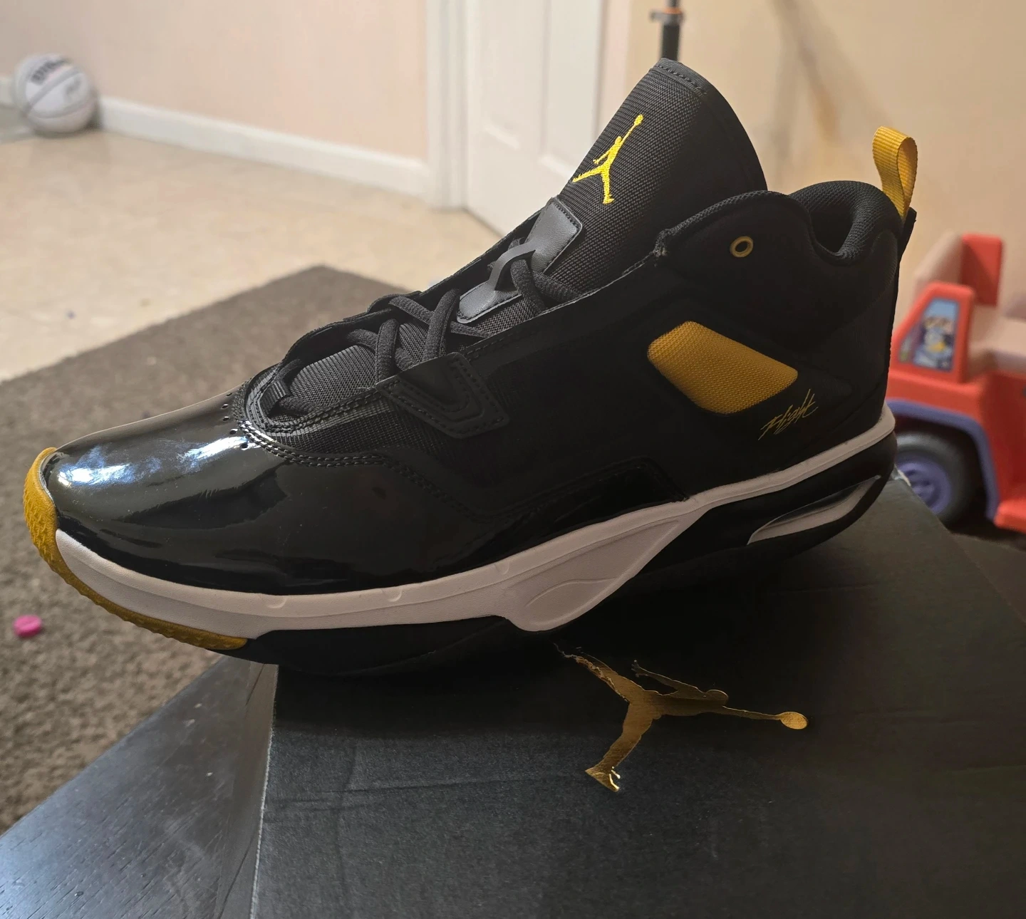 These are Jordan Stay Loyal 2 basketball shoes in black and gold. They're a US men's size 11.5. Features a patent leather toe and ankle collar.