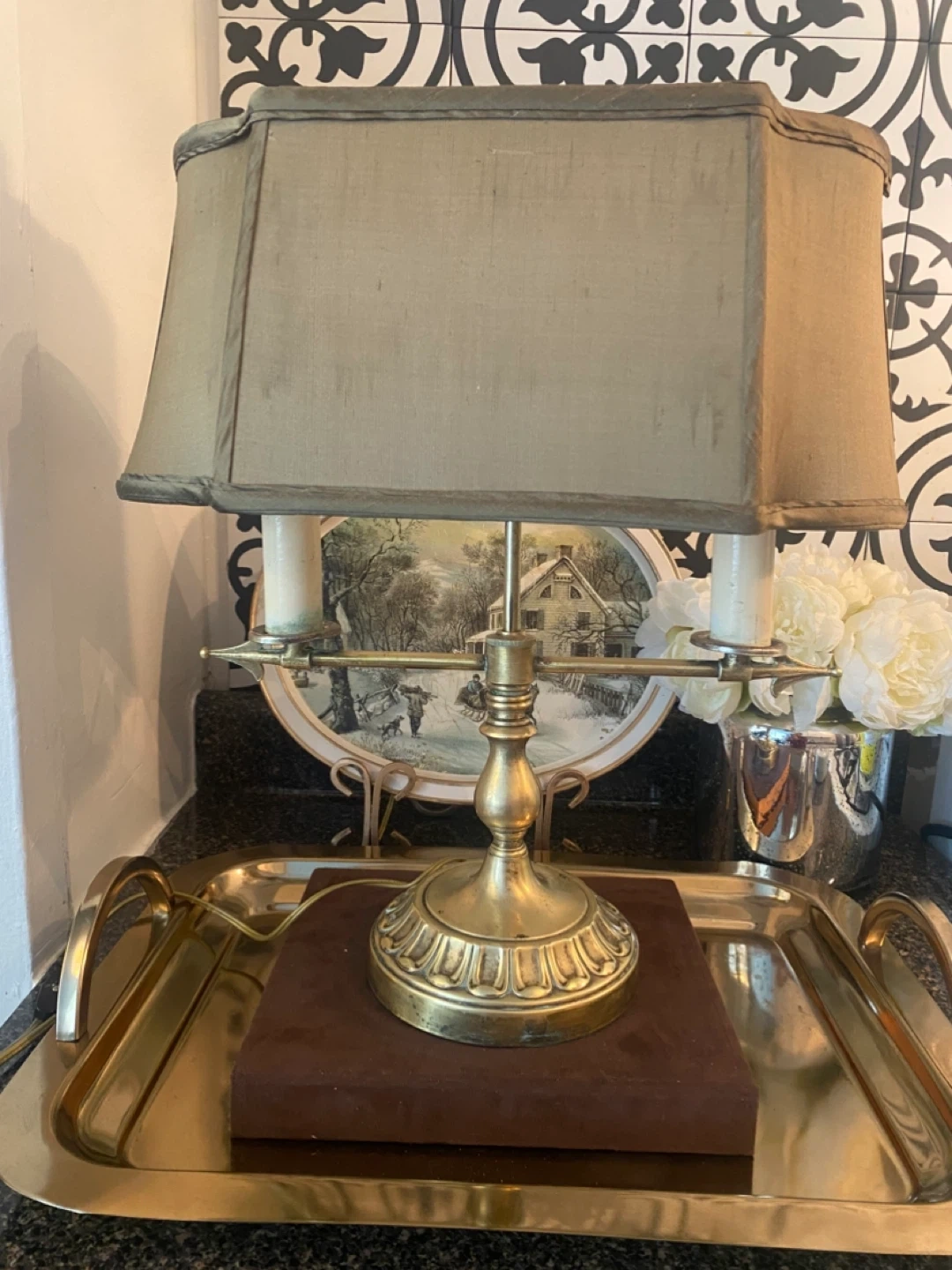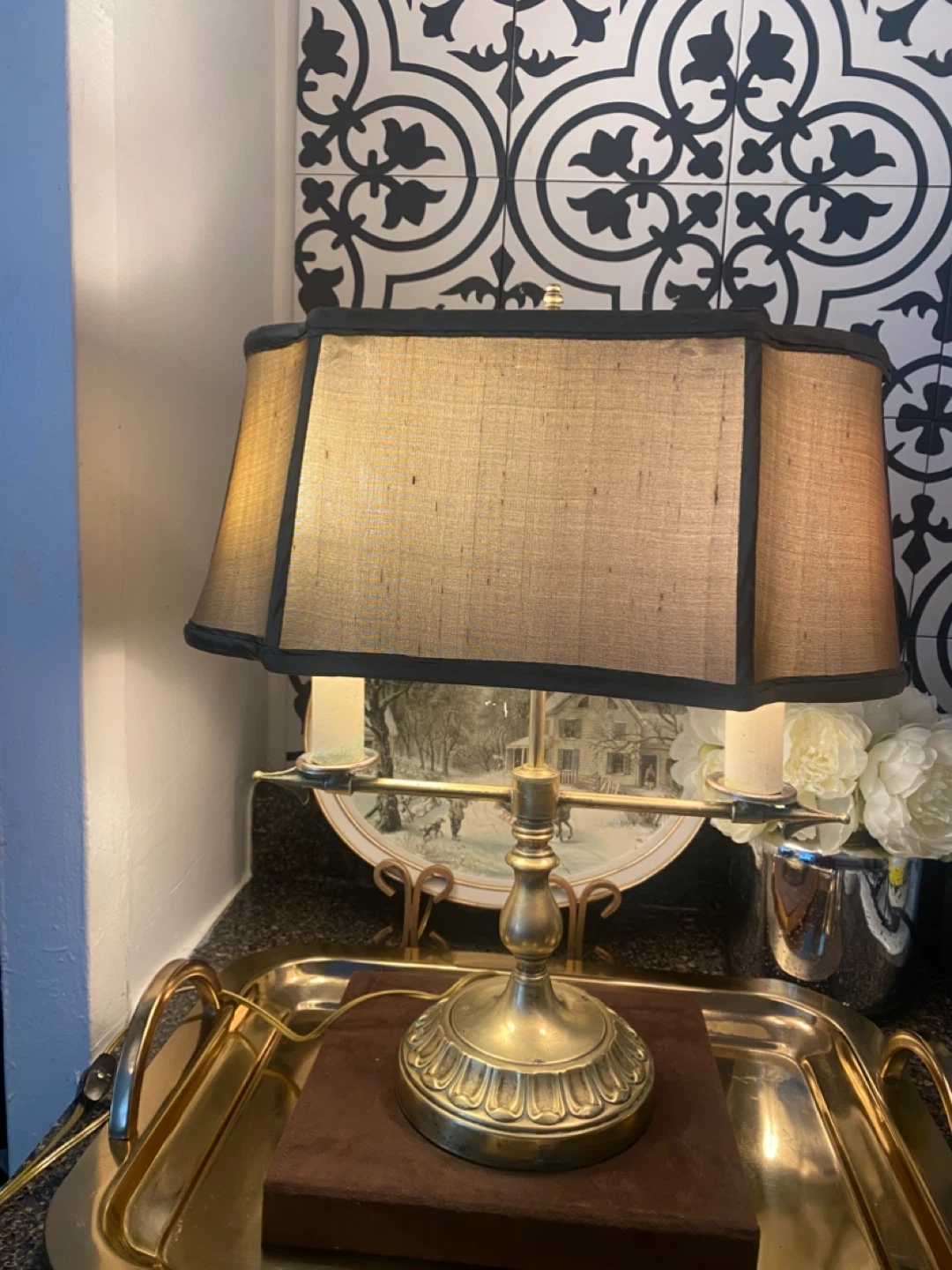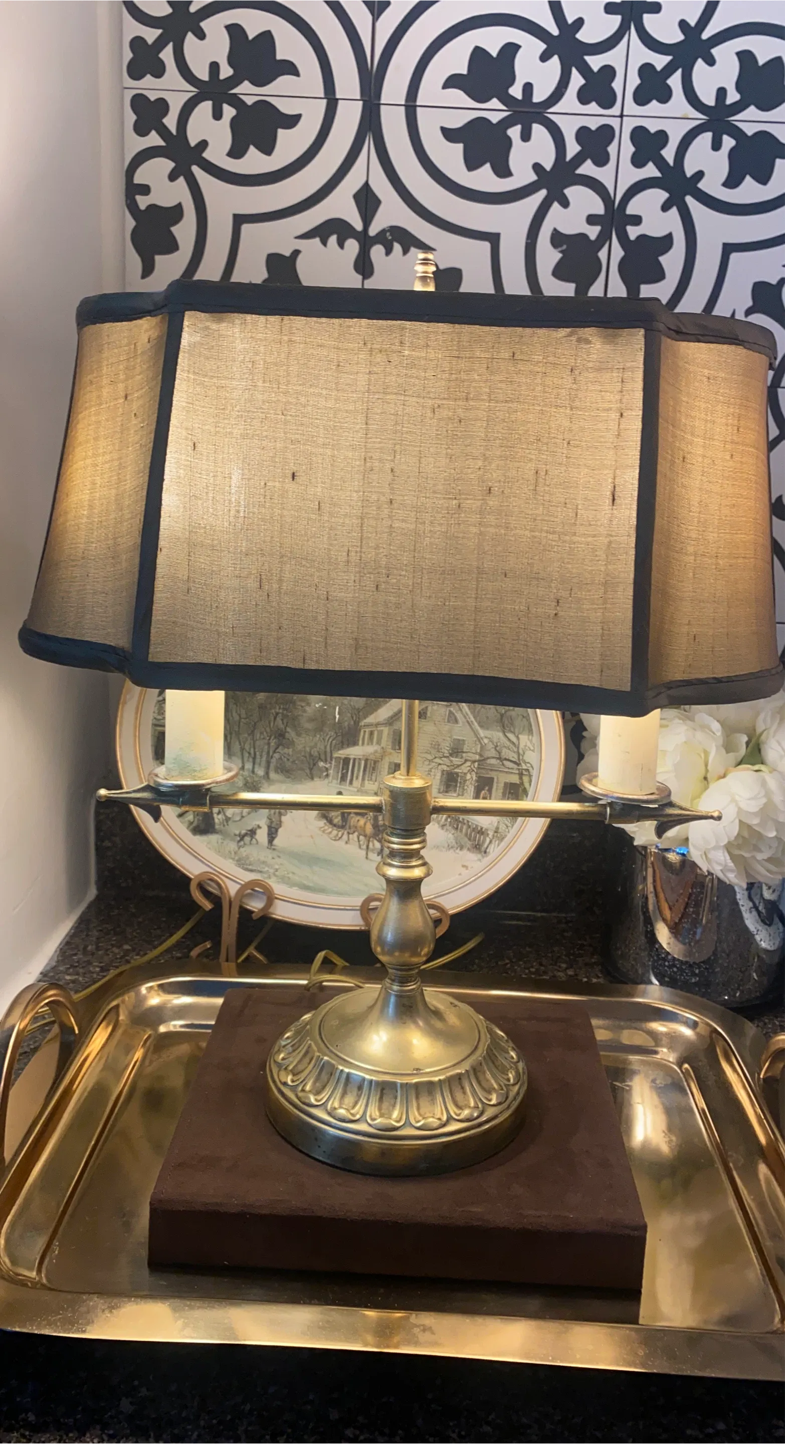 This brass lamp features a classic design with two lights. It includes the harp and a fabric shade. Dimensions: 16 inches tall to finial, shade diameter is 13 inches. @casa_s_decor