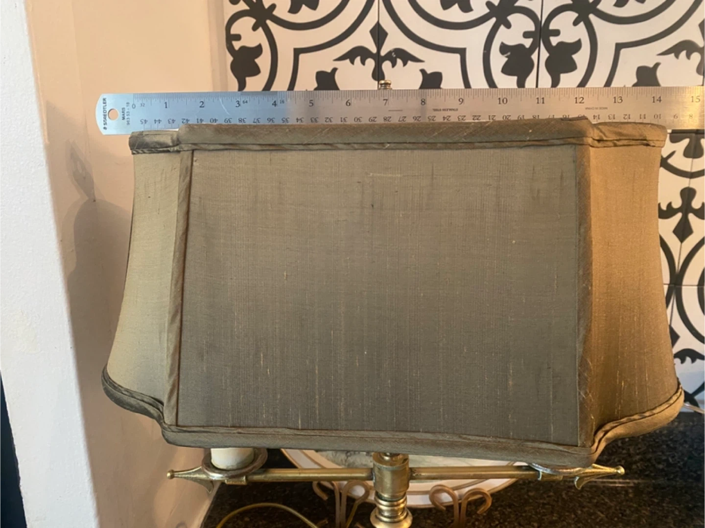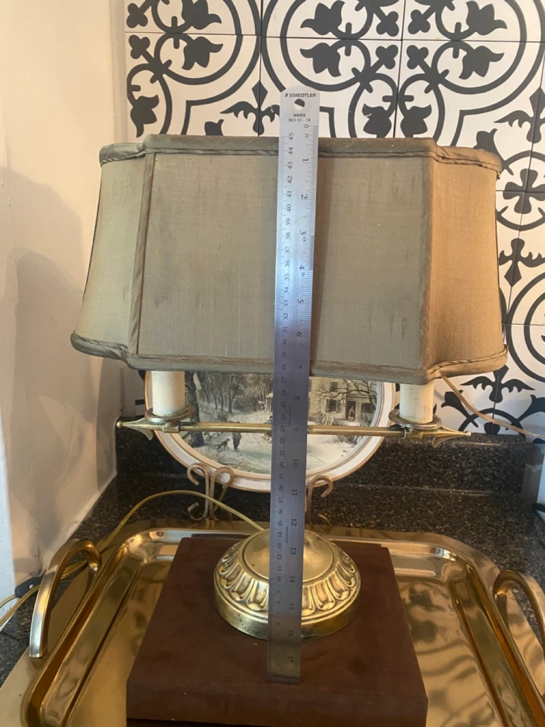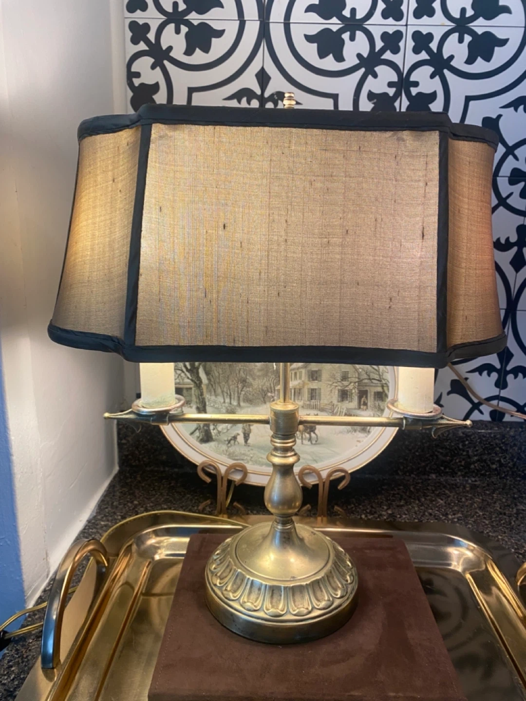 This brass lamp features a classic design with two lights. It includes the harp and a fabric shade. Dimensions: 16 inches tall to finial, shade diameter is 13 inches. @casa_s_decor