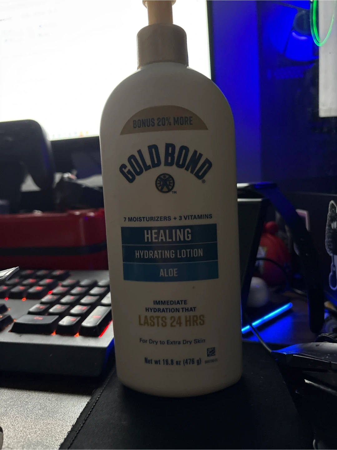 Gold Bond Healing Hydrating Lotion with Aloe. It contains 7 moisturizers and 3 vitamins. Provides immediate hydration that lasts 24 hours for dry to extra dry skin.