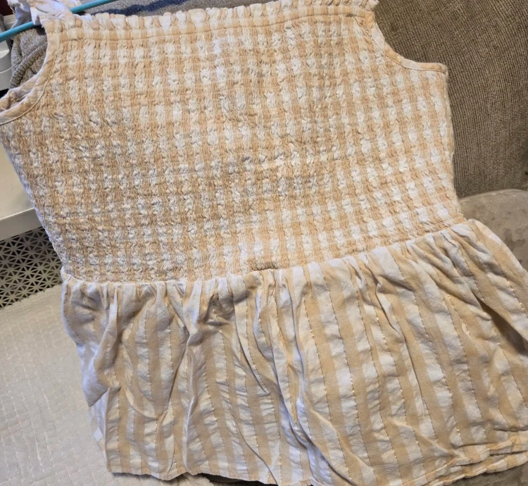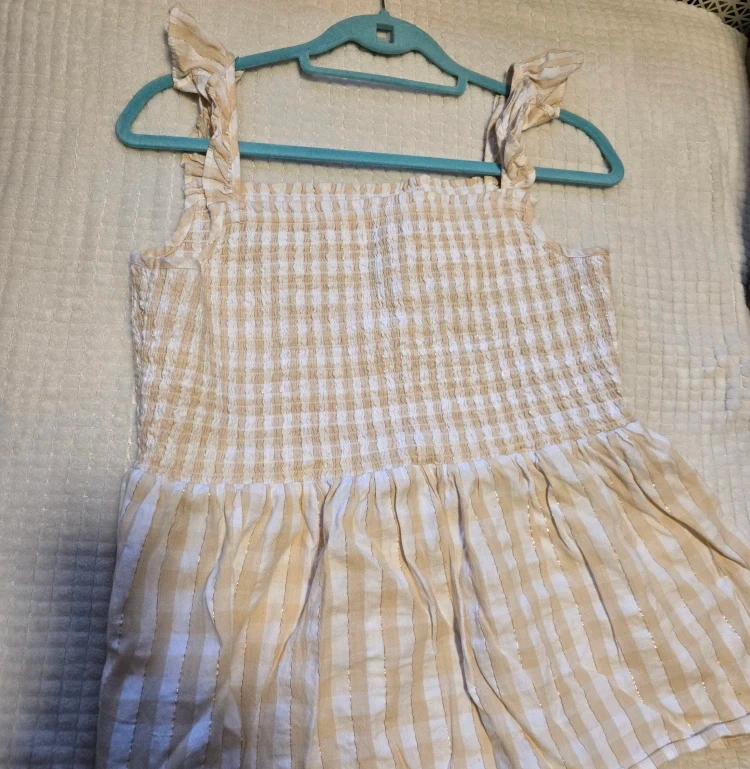 This cute tank top features a smocked bodice with a gingham pattern and a tiered, ruffled hem. (Only worn once!)