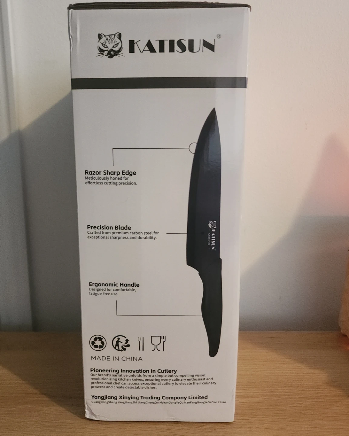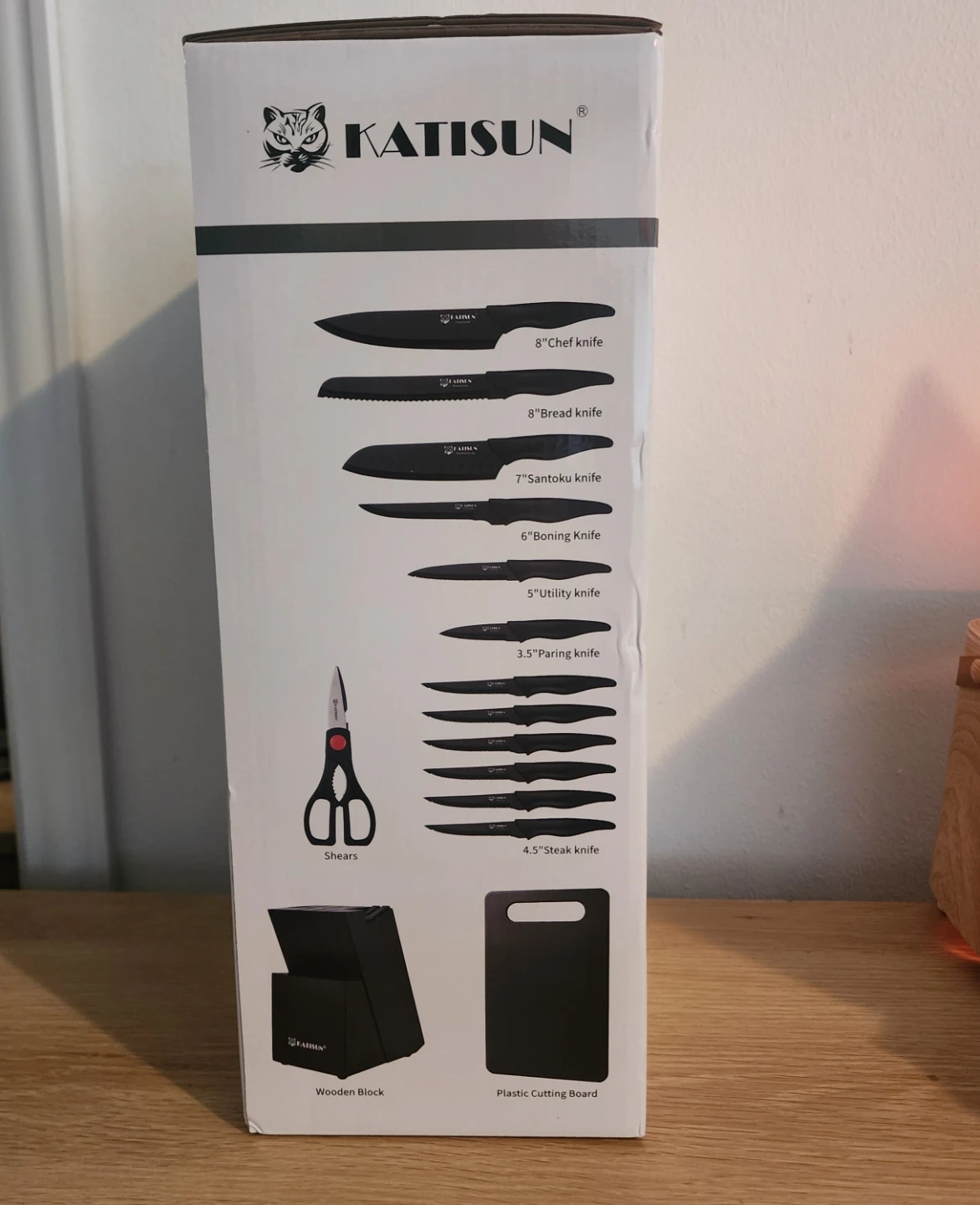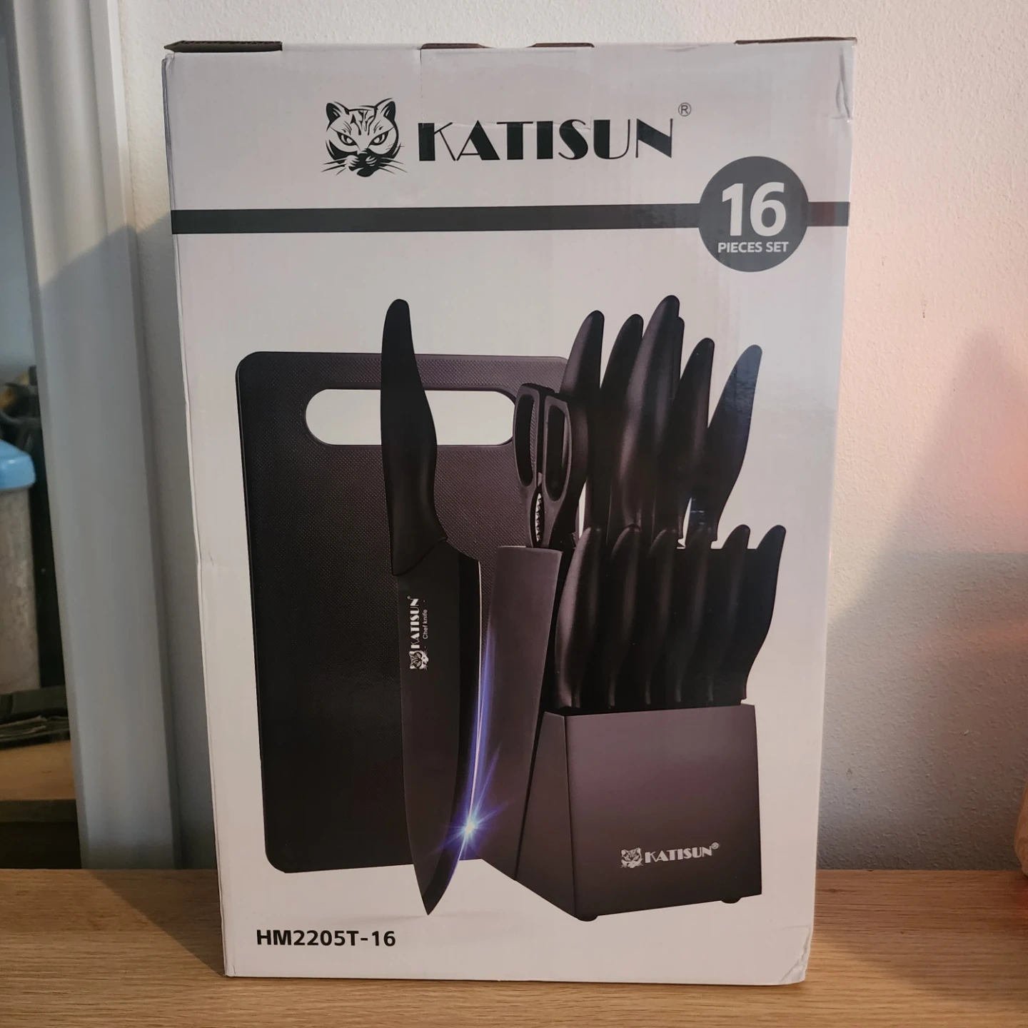 This KATISUN knife block set includes 16 pieces. Knives are crafted from premium carbon steel. They feature razor-sharp edges and ergonomic handles for fatigue-free use. The set comes with a wooden block, plastic cutting board, and shears.