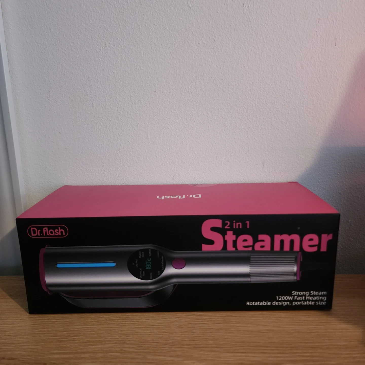 This is a Dr. Flash 2-in-1 portable handheld steamer. It offers strong steam with 1200W fast heating. The design is rotatable and portable.